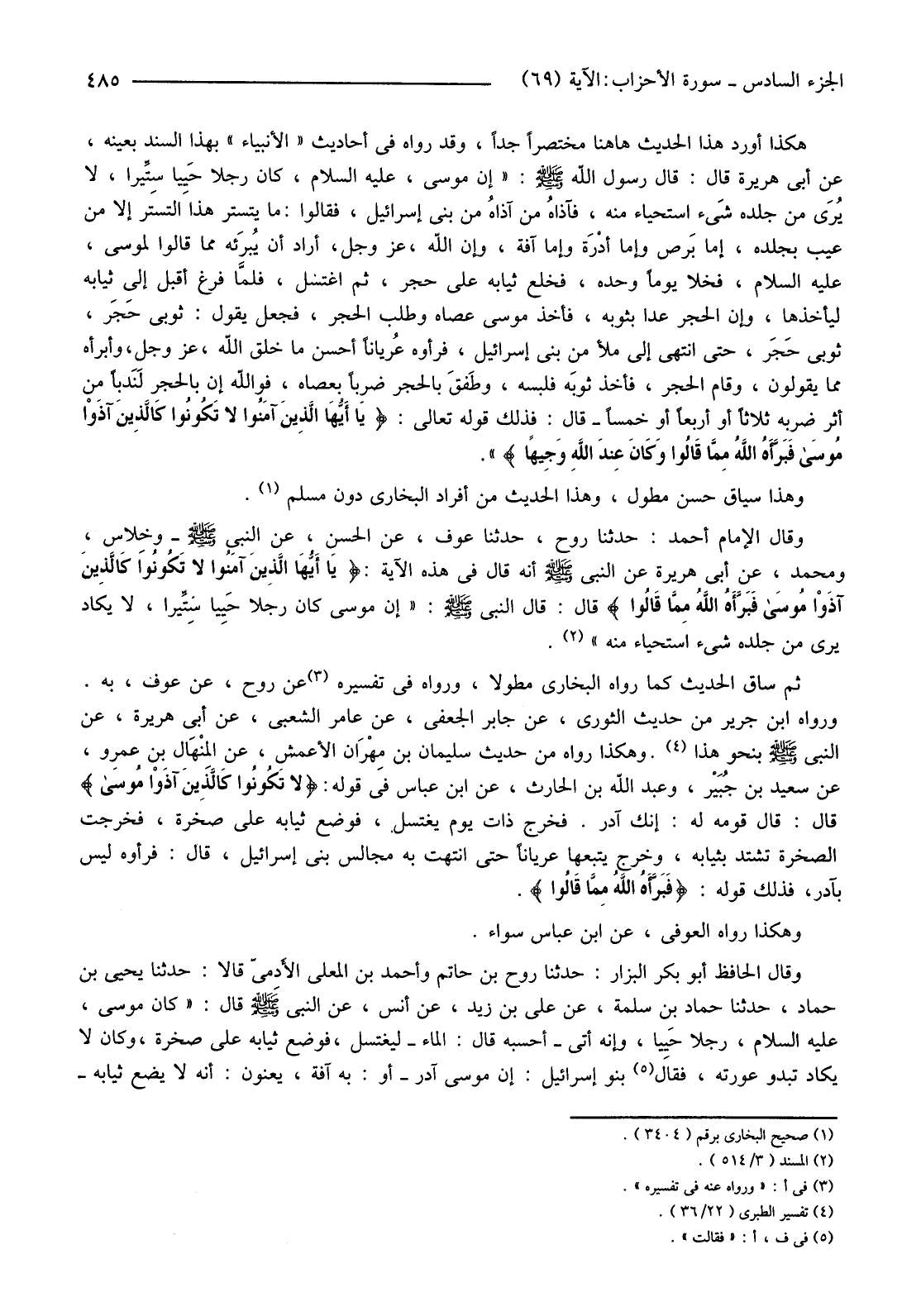 ثُمَّ سَاقَ الْحَدِيثَ كَمَا رَوَاهُ الْبُخَارِيُّ مُطَوَّلًا وَرَوَاهُ فِي تَفْسِيرِهِ (3) . عَنْ رَوْحٍ، عَنْ عَوْفٍ، بِهِ. وَرَوَاهُ ابْنُ جَرِيرٍ مِنْ حَدِيثِ الثَّوْرِيِّ، عَنْ جَابِرٍ الْجُعْفِيِّ، عَنْ عَامِرٍ الشَّعْبِيِّ، عَنْ أَبِي هُرَيْرَةَ، عَنِ النَّبِيِّ صَلَّى اللَّهُ عَلَيْهِ وَسَلَّمَ بِنَحْوِ هَذَا (4) . وَهَكَذَا رَوَاهُ مِنْ حَدِيثِ سُلَيْمَانَ بْنِ مِهْرَان الْأَعْمَشِ، عَنْ المنْهَال بْنِ عَمْرٍو، عَنْ سَعِيدِ بْنِ جُبَيْر، وَعَبْدِ اللَّهِ بْنِ الْحَارِثِ، عَنِ ابْنِ عَبَّاسٍ فِي قَوْلِهِ: {لَا تَكُونُوا كَالَّذِينَ آذَوْا مُوسَى} قَالَ: قَالَ قَوْمُهُ لَهُ: إِنَّكَ آدَرُ. فَخَرَجَ ذَاتَ يَوْمٍ يَغْتَسِلُ، فَوَضَعَ ثِيَابَهُ عَلَى صَخْرَةٍ، فَخَرَجَتِ الصَّخْرَةُ تَشْتَدُّ بِثِيَابِهِ، وَخَرَجَ يَتْبَعُهَا عُرْيَانَا حَتَّى انْتَهَتْ بِهِ مَجَالِسُ بَنِي إِسْرَائِيلَ، قَالَ: فَرَأَوْهُ لَيْسَ بِآدَرَ، فَذَلِكَ قَوْلُهُ: {فَبَرَّأَهُ اللَّهُ مِمَّا قَالُوا} .