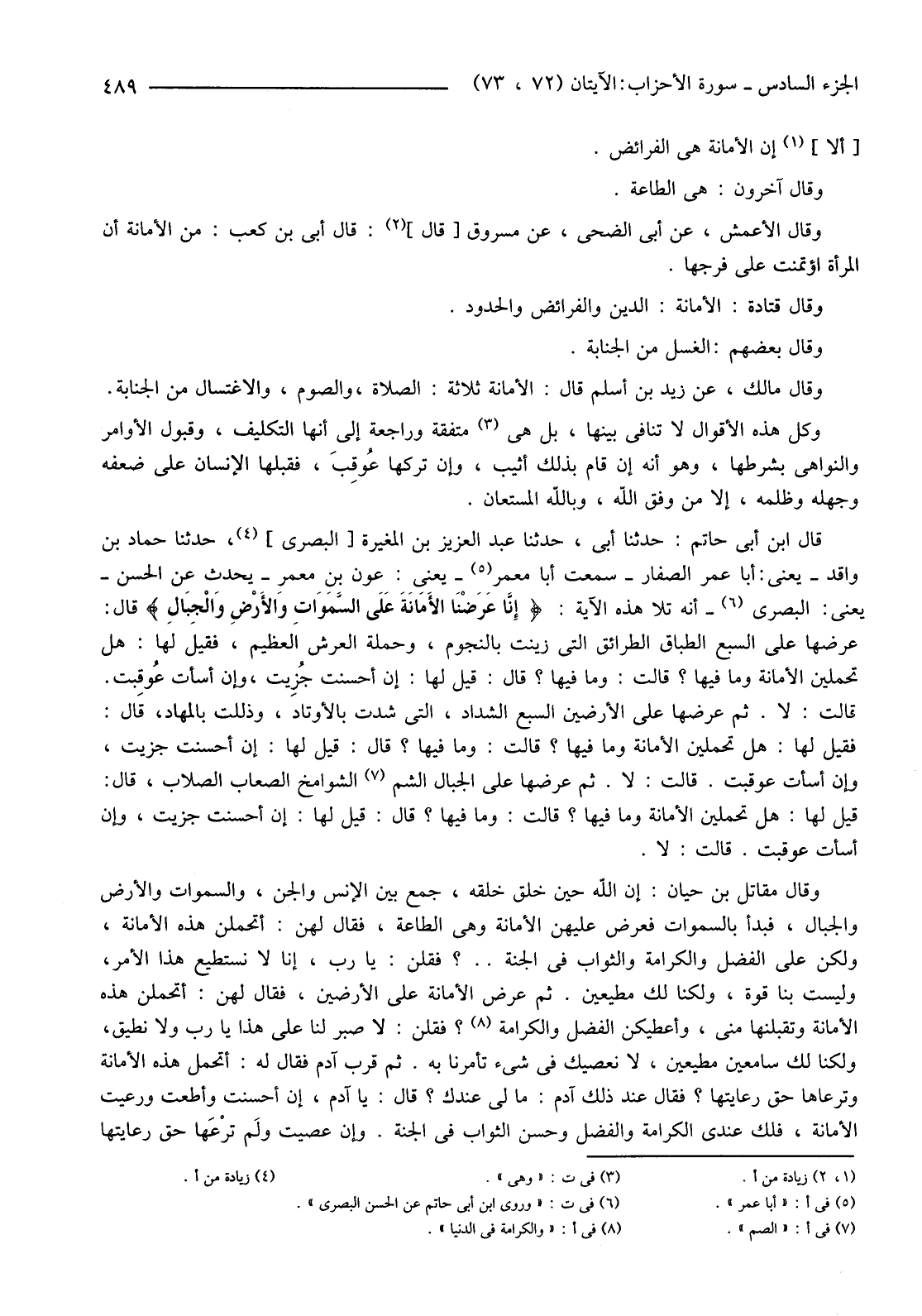 قَالَ ابْنُ أَبِي حَاتِمٍ: حَدَّثَنَا أَبِي، حَدَّثَنَا عَبْدُ الْعَزِيزِ بْنُ الْمُغِيرَةِ [الْبَصْرِيُّ] (4) ، حَدَّثَنَا حَمَّادُ بْنُ وَاقَدٍ -يَعْنِي: أَبَا عُمَرَ الصَّفَّارَ -سَمِعْتُ أَبَا مَعْمَرٍ (5) -يَعْنِي: عَوْنَ بْنَ مَعْمَرٍ -يُحَدِّثُ عَنِ الْحَسَنِ -يَعْنِي: الْبَصْرِيَّ (6) -أَنَّهُ تَلَا هَذِهِ الآية: {إِنَّا عَرَضْنَا الأمَانَةَ عَلَى السَّمَوَاتِ وَالأرْضِ وَالْجِبَالِ} قَالَ: عَرَضَهَا عَلَى السَّبْعِ الطِّبَاقِ الطَّرَائِقِ الَّتِي زُيِّنَتْ بِالنُّجُومِ، وَحَمَلَةِ الْعَرْشِ الْعَظِيمِ، فَقِيلَ لَهَا: هَلْ تَحْمِلِينَ الْأَمَانَةَ وَمَا فِيهَا؟ قَالَتْ: وَمَا فِيهَا؟ قَالَ: قِيلَ لَهَا: إِنْ أَحْسَنْتِ جُزِيت، وَإِنْ أَسَأْتِ عُوقِبْتِ. قَالَتْ: لَا. ثُمَّ عَرَضَهَا عَلَى الْأَرْضِينَ السَّبْعِ الشِّدَادِ، الَّتِي شُدَّتْ بِالْأَوْتَادِ، وَذُلِّلَتْ بِالْمِهَادِ، قَالَ: فَقِيلَ لَهَا: هَلْ تَحْمِلِينَ الْأَمَانَةَ وَمَا فِيهَا؟ قَالَتْ: وَمَا فِيهَا؟ قَالَ: قِيلَ لَهَا: إِنْ أَحْسَنْتِ جُزِيتِ، وَإِنْ أَسَأْتِ عُوقِبْتِ. قَالَتْ: لَا. ثُمَّ عَرَضَهَا عَلَى الْجِبَالِ الشُّمِّ (7) الشَّوَامِخِ الصِّعَابِ الصِّلَابِ، قَالَ: قِيلَ لَهَا: هَلْ تَحْمِلِينَ الْأَمَانَةَ وَمَا فِيهَا؟ قَالَتْ: وَمَا فِيهَا؟ قَالَ: قِيلَ لَهَا: إِنْ أَحْسَنْتِ جُزِيتِ، وَإِنْ أَسَأْتِ عُوقِبْتِ. قَالَتْ: لَا.