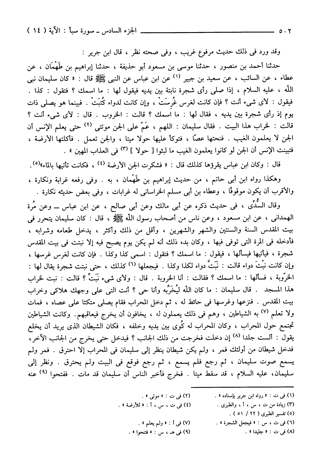 حَدَّثَنَا أَحْمَدُ بْنُ مَنْصُورٍ، حَدَّثَنَا مُوسَى بْنُ مَسْعُودٍ أَبُو حُذَيْفَةَ، حَدَّثَنَا إِبْرَاهِيمُ بْنُ طَهْمَان، عَنْ عَطَاءٍ، عَنْ السَّائِبِ، عَنْ سَعِيدِ بْنِ جُبَيْرٍ (1) عَنِ ابْنِ عَبَّاسٍ عَنِ النَّبِيِّ صَلَّى اللَّهُ عَلَيْهِ وَسَلَّمَ قَالَ: "كَانَ سُلَيْمَانُ نَبِيُّ اللَّهِ، عَلَيْهِ السَّلَامُ، إِذَا صَلَّى رَأَى شَجَرَةً نَابِتَةً بَيْنَ يَدَيْهِ فَيَقُولُ لَهَا: مَا اسْمُكِ؟ فَتَقُولُ: كَذَا. فَيَقُولُ: لِأَيِّ شَيْءٍ أَنْتِ؟ فَإِنْ كَانَتْ لِغَرْسٍ غُرِسَتْ، وَإِنْ كَانَتْ لِدَوَاءٍ كُتِبَتْ. فَبَيْنَمَا هُوَ يُصَلِّي ذَاتَ يَوْمٍ إِذْ رَأَى شَجَرَةً بَيْنَ يَدَيْهِ، فَقَالَ لَهَا: مَا اسْمُكِ؟ قَالَتْ: الْخَرُّوبُ. قَالَ: لِأَيِّ شَيْءٍ أَنْتِ؟ قَالَتْ: لِخَرَابِ هَذَا الْبَيْتِ. فَقَالَ سُلَيْمَانُ: اللَّهُمَّ، عَمّ عَلَى الْجِنِّ مَوْتَتِي (2) حَتَّى يَعْلَمَ الْإِنْسُ أَنَّ الْجِنَّ لَا يَعْلَمُونَ الْغَيْبَ. فَنَحَتَهَا عَصًا، فَتَوَكَّأَ عَلَيْهَا حَوْلًا مَيِّتًا، وَالْجِنُّ تَعْمَلُ. فَأَكَلَتْهَا الْأَرَضَةُ، فَتَبَيَّنَتِ الْإِنْسُ أَنَّ الْجِنَّ لَوْ كَانُوا يَعْلَمُونَ الْغَيْبَ مَا لَبِثُوا [حَوْلًا] (3) فِي الْعَذَابِ الْمُهِينِ".