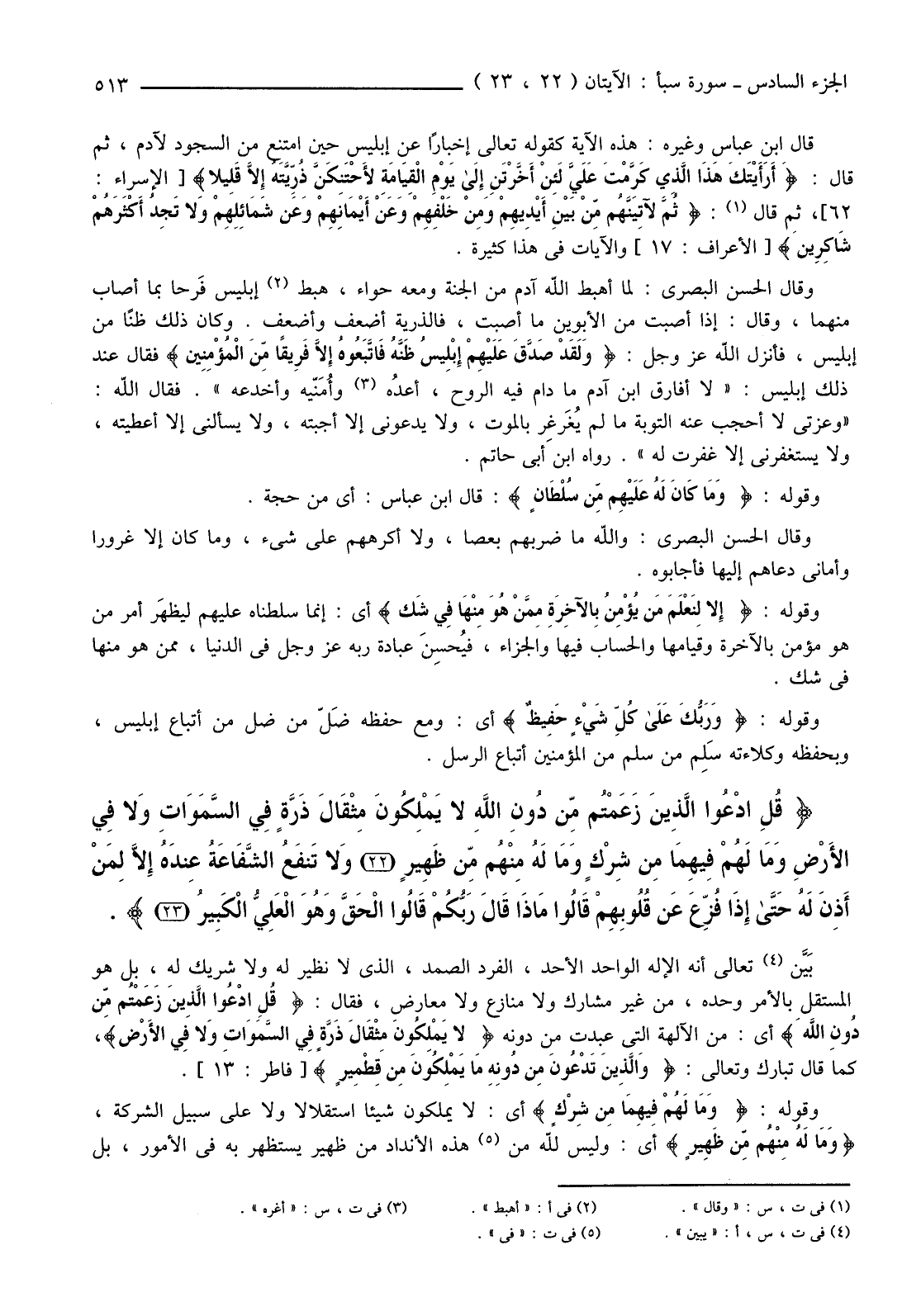 قَالَ ابْنُ عَبَّاسٍ وَغَيْرُهُ: هَذِهِ الْآيَةُ كَقَوْلِهِ تَعَالَى إِخْبَارًا عَنْ إِبْلِيسٍ حِينَ امْتَنَعَ مِنَ السُّجُودِ لِآدَمَ، ثُمَّ قَالَ: {أَرَأَيْتَكَ هَذَا الَّذِي كَرَّمْتَ عَلَيَّ لَئِنْ أَخَّرْتَنِ إِلَى يَوْمِ الْقِيَامَةِ لأحْتَنِكَنَّ ذُرِّيَّتَهُ إِلا قَلِيلا} [الْإِسْرَاءِ: 62] ، ثُمَّ قَالَ: (1) {ثُمَّ لآتِيَنَّهُمْ مِنْ بَيْنِ أَيْدِيهِمْ وَمِنْ خَلْفِهِمْ وَعَنْ أَيْمَانِهِمْ وَعَنْ شَمَائِلِهِمْ وَلا تَجِدُ أَكْثَرَهُمْ شَاكِرِينَ} [الْأَعْرَافُ: 17] وَالْآيَاتُ فِي هَذَا كَثِيرَةٌ.