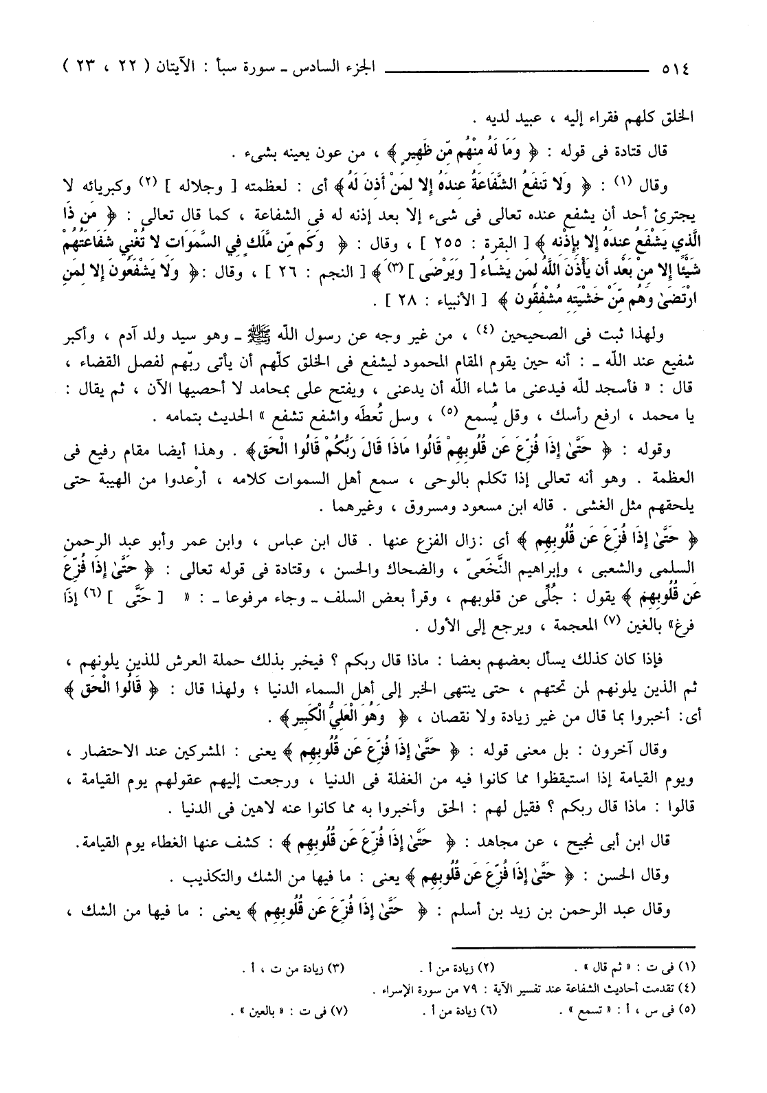 {حَتَّى إِذَا فُزِّعَ عَنْ قُلُوبِهِم} أَيْ: زَالَ الْفَزَعُ عَنْهَا. قَالَ ابْنُ عَبَّاسٍ، وَابْنُ عُمَرَ وَأَبُو عَبْدِ الرَّحْمَنِ السُّلَمِيُّ وَالشَّعْبِيُّ، وَإِبْرَاهِيمُ النَّخَعيّ، وَالضَّحَّاكُ وَالْحَسَنُ، وَقَتَادَةُ فِي قَوْلِهِ تَعَالَى: {حَتَّى إِذَا فُزِّعَ عَنْ قُلُوبِهِم} يَقُولُ: جُلِّى عَنْ قُلُوبِهِمْ، وَقَرَأَ بَعْضُ السَّلَفِ -وَجَاءَ مَرْفُوعًا-: " [حَتَّى] (6) إذَا فُرِّغَ" بِالْغَيْنِ (7) الْمُعْجَمَةِ، وَيَرْجِعُ إِلَى الْأَوَّلِ.