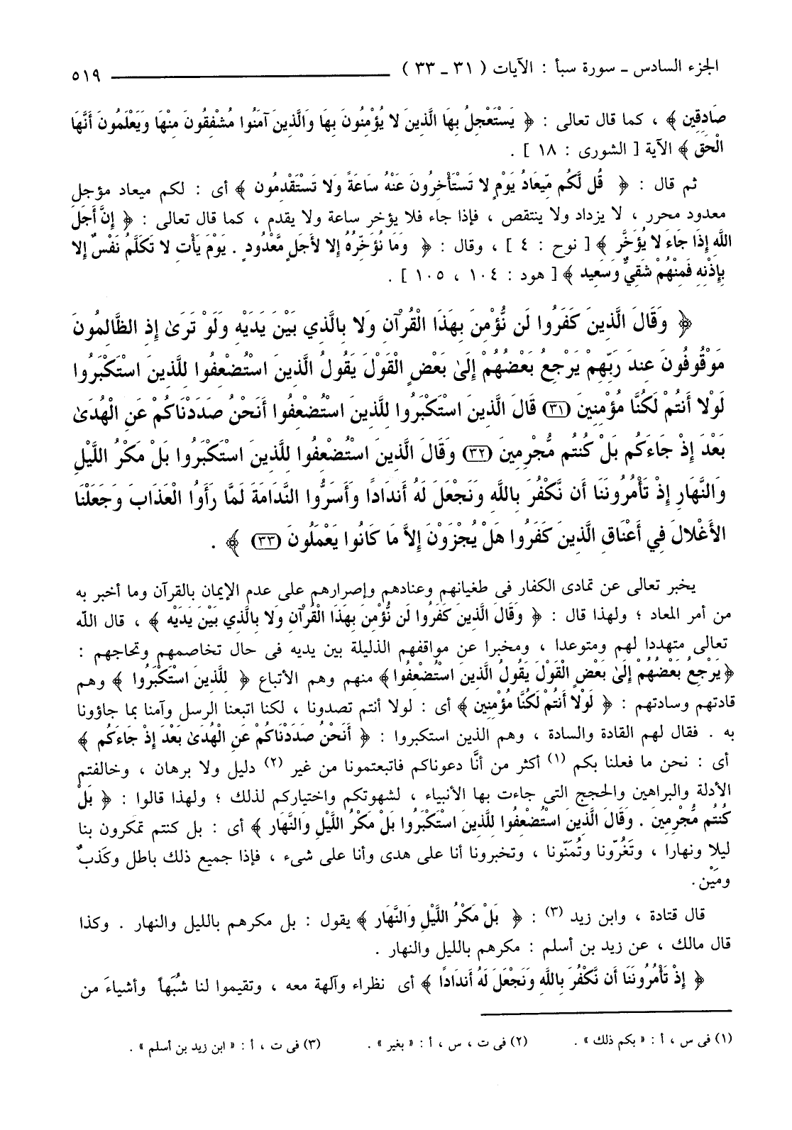 يُخْبِرُ تَعَالَى عَنْ تَمَادِي الْكُفَّارِ فِي طُغْيَانِهِمْ وَعِنَادِهِمْ وَإِصْرَارِهِمْ عَلَى عَدَمِ الْإِيمَانِ بِالْقُرْآنِ وَمَا أَخْبَرَ بِهِ مِنْ أَمْرِ الْمَعَادِ؛ وَلِهَذَا قَالَ: {وَقَالَ الَّذِينَ كَفَرُوا لَنْ نُؤْمِنَ بِهَذَا الْقُرْآنِ وَلا بِالَّذِي بَيْنَ يَدَيْهِ} . قَالَ اللَّهُ تَعَالَى مُتَهَدِّدًا لَهُمْ وَمُتَوَعِّدًا، وَمُخْبِرًا عَنْ مَوَاقِفِهِمُ الذَّلِيلَةِ بَيْنَ يَدَيْهِ فِي حَالِ تُخَاصِمِهِمْ وَتَحَاجِّهِمْ: {يَرْجِعُ بَعْضُهُمْ إِلَى بَعْضٍ الْقَوْلَ يَقُولُ الَّذِينَ اسْتُضْعِفُوا} مِنْهُمْ وَهُمُ الْأَتْبَاعُ {لِلَّذِينَ اسْتَكْبَرُوا} وَهُمْ قَادَتُهُمْ وَسَادَتُهُمْ: {لَوْلا أَنْتُمْ لَكُنَّا مُؤْمِنِينَ} أَيْ: لَوْلَا أَنْتُمْ تَصُدُّونَا، لَكُنَّا اتَّبَعْنَا الرُّسُلَ وَآمَنَّا بِمَا جاؤونا بِهِ. فَقَالَ لَهُمُ الْقَادَةُ وَالسَّادَةُ، وَهُمُ الَّذِينَ اسْتَكْبَرُوا: {أَنَحْنُ صَدَدْنَاكُمْ عَنِ الْهُدَى بَعْدَ إِذْ جَاءَكُمْ} أَيْ: نَحْنُ مَا فَعَلْنَا بِكُمْ (1) أَكْثَرَ مِنْ أنَّا دَعَوْنَاكُمْ فَاتَّبَعْتُمُونَا مِنْ غَيْرِ (2) دَلِيلٍ وَلَا بُرْهَانٍ، وَخَالَفْتُمُ الْأَدِلَّةَ وَالْبَرَاهِينَ وَالْحُجَجَ الَّتِي جَاءَتْ بِهَا الْأَنْبِيَاءُ، لِشَهْوَتِكُمْ وَاخْتِيَارِكُمْ لِذَلِكَ؛ وَلِهَذَا قَالُوا: {بَلْ كُنْتُمْ مُجْرِمِينَ. وَقَالَ الَّذِينَ اسْتُضْعِفُوا لِلَّذِينَ اسْتَكْبَرُوا بَلْ مَكْرُ اللَّيْلِ وَالنَّهَار} أَيْ: بَلْ كُنْتُمْ تَمْكُرُونَ بِنَا لَيْلًا وَنَهَارًا، وتَغُرّونا وتُمَنّونا، وَتُخْبِرُونَا أَنَّا عَلَى هُدًى وَأَنَّا عَلَى شَيْءٍ، فَإِذَا جَمِيعُ ذَلِكَ بَاطِلٌ وكَذبٌ ومَيْن.