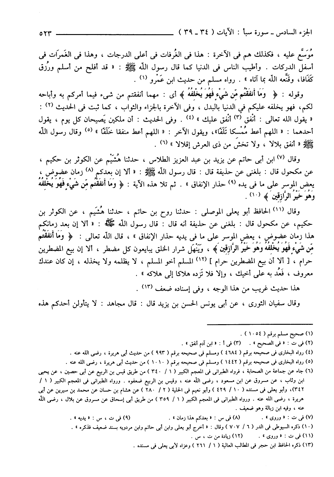 وَقَوْلُهُ: {وَمَا أَنْفَقْتُمْ مِنْ شَيْءٍ فَهُوَ يُخْلِفُهُ} أَيْ: مَهْمَا أَنْفَقْتُمْ مِنْ شَيْءٍ فِيمَا أَمَرَكُمْ بِهِ وَأَبَاحَهُ لَكُمْ، فَهُوَ يُخْلِفُهُ عَلَيْكُمْ فِي الدُّنْيَا بِالْبَدَلِ، وَفِي الْآخِرَةِ بِالْجَزَاءِ وَالثَّوَابِ، كَمَا ثَبَتَ فِي الْحَدِيثِ (2) : يَقُولُ اللَّهُ تَعَالَى: أنْفق (3) أنْفق عَلَيْكَ" (4) . وَفِي الْحَدِيثِ: أَنَّ مَلِكَيْنِ يَصيحان كُلَّ يَوْمٍ، يَقُولُ أَحَدُهُمَا: "اللَّهُمَّ أَعْطِ مُمْسِكا تَلَفًا"، وَيَقُولُ الْآخَرُ: "اللَّهُمَّ أَعْطِ مُنْفِقًا خَلَفًا" (5) وَقَالَ رَسُولُ اللَّهِ صَلَّى اللَّهُ عَلَيْهِ وَسَلَّمَ "أَنْفِقْ بِلَالًا وَلَا تَخْشَ مِنْ ذِي الْعَرْشِ إِقْلَالَا" (6) .