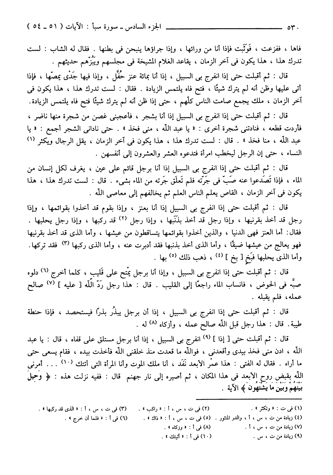 قَالَ: ثُمَّ أَقْبَلْتُ حَتَّى إذا انفرج بي السبيل إذا أنا برجل قَائِمٍ عَلَى عَيْنٍ، يَغْرِفُ لِكُلِّ إِنْسَانٍ مِنَ الْمَاءِ، فَإِذَا تَصَدعوا عَنْهُ صَبّ فِي جَرّته فَلَمْ تَعلَق جَرته مِنَ الْمَاءِ بِشَيْءٍ. قَالَ: لَسْتَ تُدْرِكُ هَذَا، هَذَا يَكُونُ فِي آخِرِ الزَّمَانِ، الْقَاصُّ يُعَلِّمُ النَّاسَ الْعِلْمَ ثُمَّ يُخَالِفُهُمْ إِلَى مَعَاصِي اللَّهِ.
