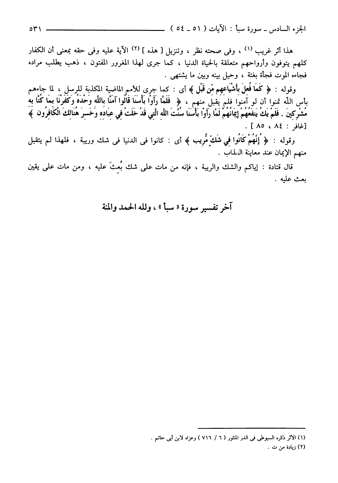 آخَرُ تَفْسِيرِ سورة "سبأ" ولله الحمد والمنة.