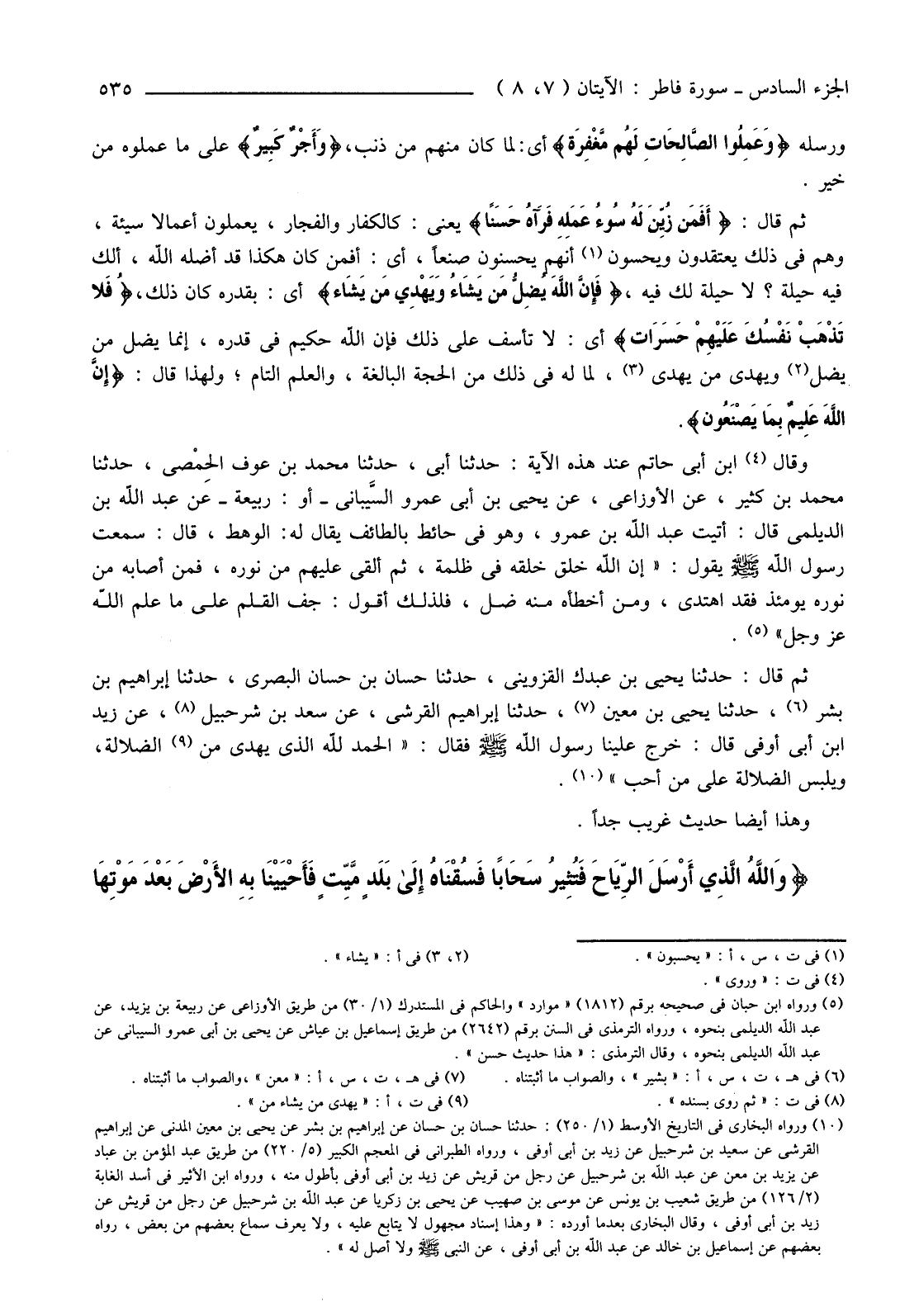 ثُمَّ قَالَ: {أَفَمَنْ زُيِّنَ لَهُ سُوءُ عَمَلِهِ فَرَآهُ حَسَنًا} يَعْنِي: كَالْكُفَّارِ وَالْفُجَّارِ، يَعْمَلُونَ أَعْمَالًا سَيِّئَةً، وَهُمْ فِي ذَلِكَ يَعْتَقِدُونَ وَيُحِسُّونَ (1) أَنَّهُمْ يُحْسِنُونَ صُنْعًا، أَيْ: أَفَمَنْ كَانَ هَكَذَا قَدْ أَضَلَّهُ اللَّهُ، أَلَكَ فِيهِ حِيلَةٌ؟ لَا حِيلَةَ لَكَ فِيهِ، {فَإِنَّ اللَّهَ يُضِلُّ مَنْ يَشَاءُ وَيَهْدِي مَنْ يَشَاءُ} أَيْ: بِقَدَرِهِ كَانَ ذَلِكَ، {فَلا تَذْهَبْ نَفْسُكَ عَلَيْهِمْ حَسَرَاتٍ} أَيْ: لَا تَأْسَفْ عَلَى ذَلِكَ فَإِنَّ اللَّهَ حَكِيمٌ فِي قَدَرِهِ، إِنَّمَا يُضِلُّ مَنْ يُضِلُّ (2) وَيَهْدِي مَنْ يَهْدِي (3) ، لِمَا لَهُ فِي ذَلِكَ مِنَ الْحُجَّةِ الْبَالِغَةِ، وَالْعِلْمِ التَّامِّ؛ وَلِهَذَا قَالَ: {إِنَّ اللَّهَ عَلِيمٌ بِمَا يَصْنَعُونَ} .