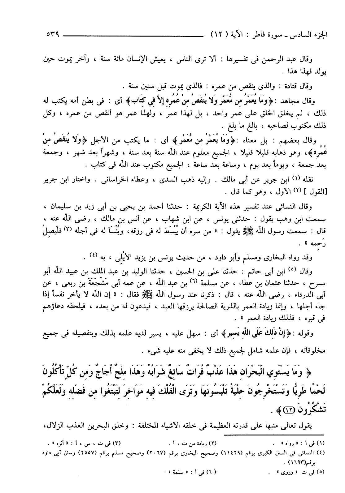 وَقَالَ بَعْضُهُمْ: بَلْ مَعْنَاهُ: {وَمَا يُعَمَّرُ مِنْ مُعَمَّرٍ} أَيْ: مَا يُكْتَبُ مِنَ الْأَجَلِ {وَلا يُنْقَصُ مِنْ عُمُرِهِ} ، وَهُوَ ذَهَابُهُ قَلِيلًا قَلِيلًا الْجَمِيعُ مَعْلُومٌ عِنْدَ اللَّهِ سَنَةً بَعْدَ سَنَةٍ، وَشَهْرًا بَعْدَ شَهْرٍ، وَجُمُعَةً بَعْدَ جُمُعَةٍ، وَيَوْمًا بَعْدَ يَوْمٍ، وَسَاعَةً بَعْدَ سَاعَةٍ، الْجَمِيعُ مَكْتُوبٌ عِنْدَ اللَّهِ فِي كِتَابٍ.