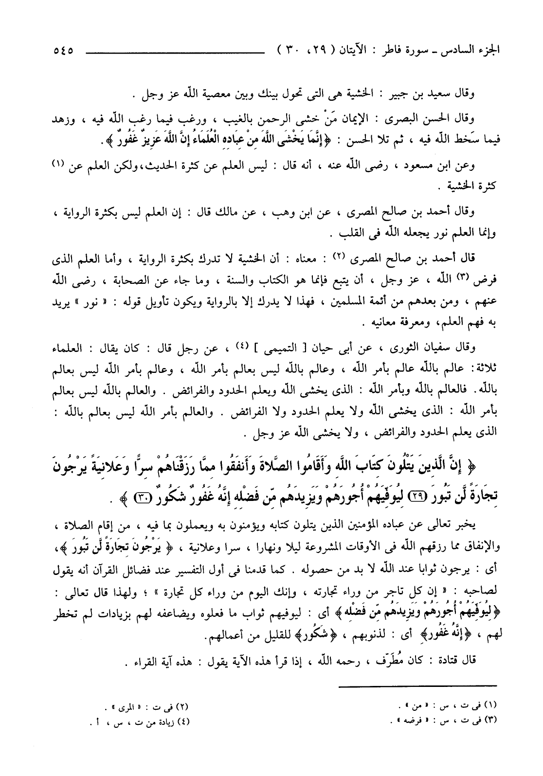 {إِنَّ الَّذِينَ يَتْلُونَ كِتَابَ اللَّهِ وَأَقَامُوا الصَّلاةَ وَأَنْفَقُوا مِمَّا رَزَقْنَاهُمْ سِرًّا وَعَلانِيَةً يَرْجُونَ تِجَارَةً لَنْ تَبُورَ (29) لِيُوَفِّيَهُمْ أُجُورَهُمْ وَيَزِيدَهُمْ مِنْ فَضْلِهِ إِنَّهُ غَفُورٌ شَكُورٌ (30) } .
