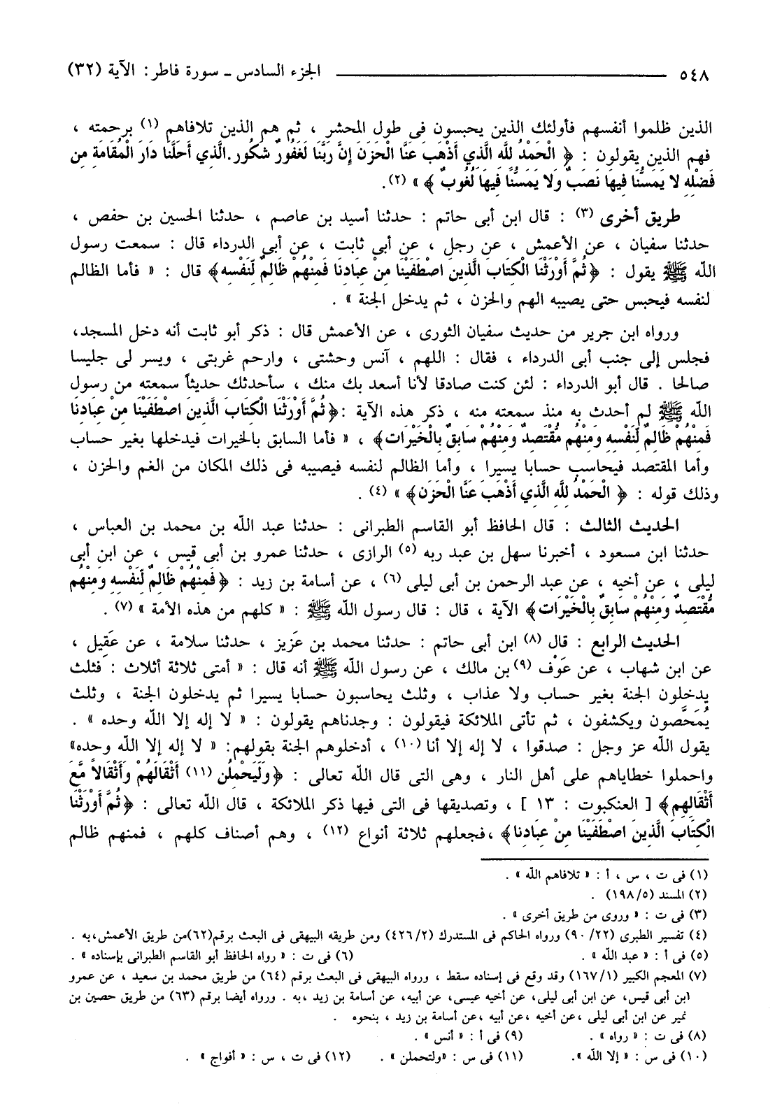 وَرَوَاهُ ابْنُ جَرِيرٍ مِنْ حَدِيثِ سُفْيَانَ الثَّوْرِيِّ، عَنِ الْأَعْمَشِ قَالَ: ذَكَرَ أَبُو ثَابِتٍ أَنَّهُ دَخَلَ الْمَسْجِدَ، فَجَلَسَ إِلَى جَنْبِ أَبِي الدَّرْدَاءِ، فَقَالَ: اللَّهُمَّ، آنِسْ وَحْشَتِي، وَارْحَمْ غُرْبَتِي، وَيَسِّرْ لِي جَلِيسًا صَالِحًا. قَالَ أَبُو الدَّرْدَاءِ: لَئِنْ كُنْتَ صَادِقًا لَأَنَا أَسْعَدُ بِكَ مِنْكَ، سَأُحَدِّثُكَ حَدِيثًا سَمِعْتَهُ مِنْ رَسُولِ اللَّهِ صَلَّى اللَّهُ عَلَيْهِ وَسَلَّمَ لَمْ أُحَدِّثْ بِهِ مُنْذُ سَمِعْتُهُ مِنْهُ، ذَكَرَ هَذِهِ الْآيَةَ: {ثُمَّ أَوْرَثْنَا الْكِتَابَ الَّذِينَ اصْطَفَيْنَا مِنْ عِبَادِنَا فَمِنْهُمْ ظَالِمٌ لِنَفْسِهِ وَمِنْهُمْ مُقْتَصِدٌ وَمِنْهُمْ سَابِقٌ بِالْخَيْرَاتِ} ، فَأَمَّا السَّابِقُ بِالْخَيْرَاتِ فَيَدْخُلُهَا بِغَيْرِ حِسَابٍ وَأَمَّا الْمُقْتَصِدُ فَيُحَاسَبُ حِسَابًا يَسِيرًا، وَأَمَّا الظَّالِمُ لِنَفْسِهِ فَيُصِيبُهُ فِي ذَلِكَ الْمَكَانِ مِنَ الْغَمِّ وَالْحُزْنِ، وَذَلِكَ قَوْلُهُ: {الْحَمْدُ لِلَّهِ الَّذِي أَذْهَبَ عَنَّا الْحَزَنَ} (4) .