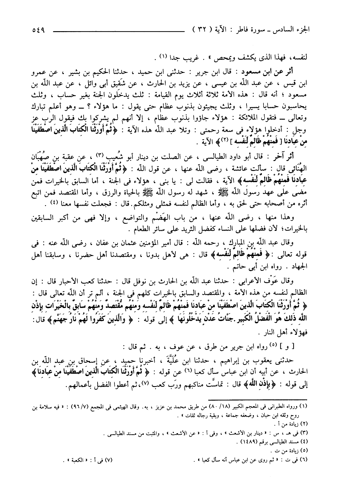 أَثَرٌ عَنِ ابْنِ مَسْعُودٍ: قَالَ ابْنُ جَرِيرٍ: حَدَّثَنِي ابْنُ حُمَيْدٍ، حَدَّثَنَا الْحَكِيمُ بْنُ بَشِيرٍ، عَنْ عَمْرِو بْنِ قَيْسٍ، عَنْ عَبْدِ اللَّهِ بْنِ عِيسَى، عَنْ يَزِيدَ بْنِ الْحَارِثِ، عَنْ شَقِيق أَبِي وَائِلٍ، عَنْ عَبْدِ اللَّهِ بْنِ مَسْعُودٍ، أَنَّهُ قَالَ: هَذِهِ الْأُمَّةُ ثَلَاثَةُ أَثْلَاثٍ يَوْمَ الْقِيَامَةِ: ثُلُثٌ يَدْخُلُونَ الْجَنَّةَ بِغَيْرِ حِسَابٍ، وَثُلُثٌ يُحَاسَبُونَ حِسَابًا يَسِيرًا، وَثُلُثٌ يَجِيئُونَ بِذُنُوبٍ عِظَامٍ حَتَّى يَقُولَ: مَا هَؤُلَاءِ؟ -وَهُوَ أَعْلَمُ تَبَارَكَ وَتَعَالَى-فَتَقُولُ الْمَلَائِكَةُ: هَؤُلَاءِ جَاءُوا بِذُنُوبٍ عِظَامٍ، إِلَّا أَنَّهُمْ لَمْ يُشْرِكُوا بِكَ فَيَقُولُ الرَّبُّ عَزَّ وَجَلَّ: أَدْخِلُوا هَؤُلَاءِ فِي سِعَةِ رَحْمَتِي: وَتَلَا عَبْدُ اللَّهِ هَذِهِ الْآيَةَ: {ثُمَّ أَوْرَثْنَا الْكِتَابَ الَّذِينَ اصْطَفَيْنَا مِنْ عِبَادِنَا [فَمِنْهُمْ ظَالِمٌ لِنَفْسِهِ] } (2) الْآيَةَ.
