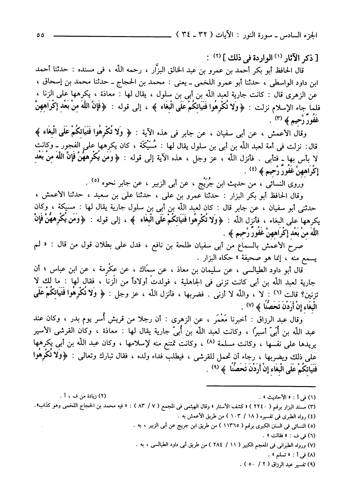وَقَالَ الْحَافِظُ أَبُو بَكْرٍ الْبَزَّارُ: حَدَّثَنَا عَمْرُو بْنُ عَلِيٍّ، حَدَّثَنَا عَلِيُّ بْنُ سَعِيدٍ، حَدَّثَنَا الْأَعْمَشُ، حَدَّثَنِي أَبُو سُفْيَانَ، عَنْ جَابِرٍ قَالَ: كان لعبد الله بن أُبَيٍّ ابنِ سلولَ جَارِيَةٌ يُقَالُ لَهَا: مُسَيْكَةُ، وَكَانَ يُكْرِهُهَا عَلَى الْبِغَاءِ، فَأَنْزَلَ اللَّهُ: {وَلا تُكْرِهُوا فَتَيَاتِكُمْ عَلَى الْبِغَاءِ} ، إِلَى قَوْلِهِ: {وَمَنْ يُكْرِهْهُنَّ فَإِنَّ اللَّهَ مِنْ بَعْدِ إِكْرَاهِهِنَّ غَفُورٌ رَحِيمٌ} .