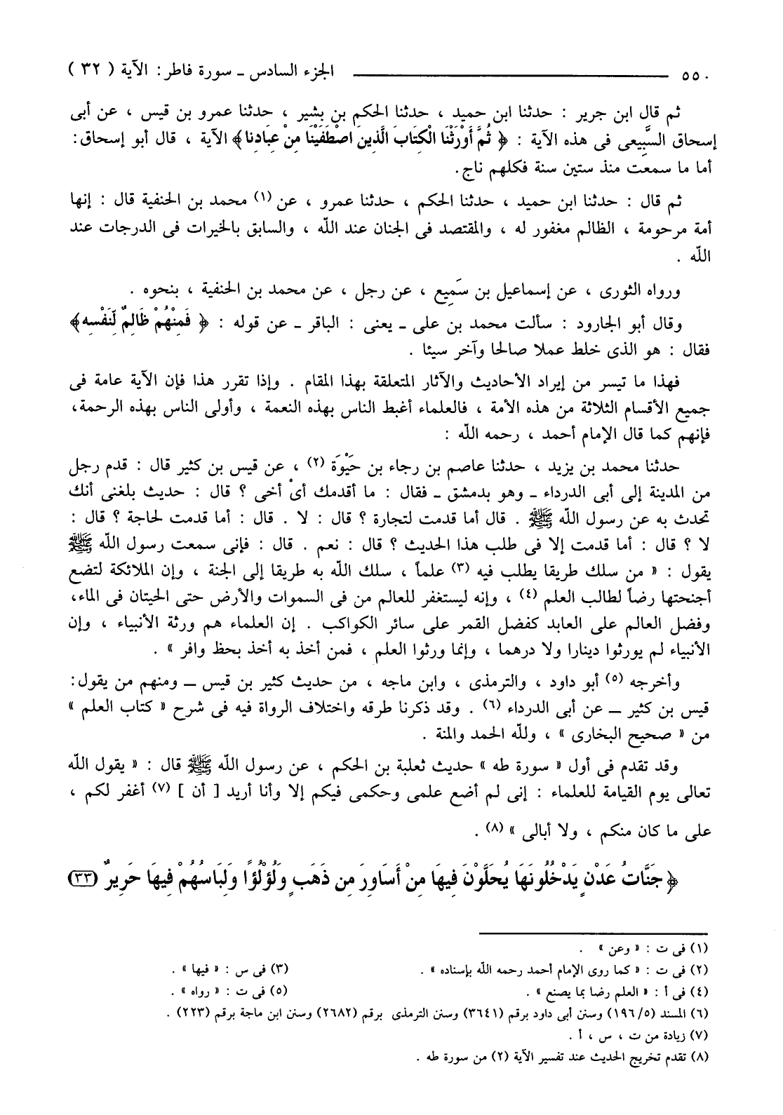 فَهَذَا مَا تَيَسَّرَ مِنْ إِيرَادِ الْأَحَادِيثِ وَالْآثَارِ الْمُتَعَلِّقَةِ بِهَذَا الْمَقَامِ. وَإِذَا تَقَرَّرَ هَذَا فَإِنَّ الْآيَةَ عَامَّةٌ فِي جَمِيعِ الْأَقْسَامِ الثَّلَاثَةِ مِنْ هَذِهِ الْأُمَّةِ، فَالْعُلَمَاءُ أَغْبَطُ النَّاسِ بِهَذِهِ النِّعْمَةِ، وَأَوْلَى النَّاسِ بِهَذِهِ الرَّحْمَةِ، فَإِنَّهُمْ كَمَا قَالَ الْإِمَامُ أَحْمَدُ، رَحِمَهُ اللَّهُ:
