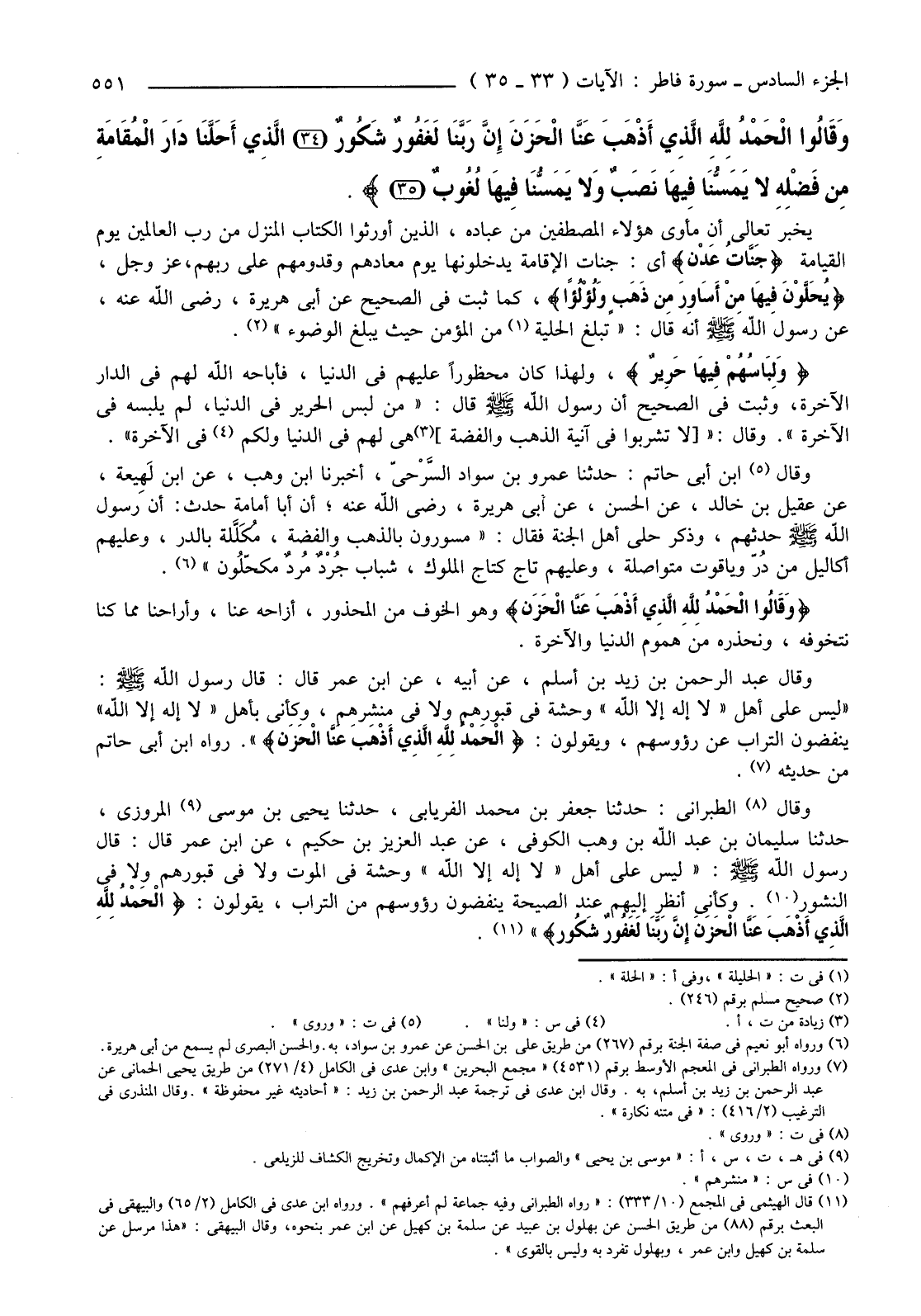 {جَنَّاتُ عَدْنٍ يَدْخُلُونَهَا يُحَلَّوْنَ فِيهَا مِنْ أَسَاوِرَ مِنْ ذَهَبٍ وَلُؤْلُؤًا وَلِبَاسُهُمْ فِيهَا حَرِيرٌ (33) وَقَالُوا الْحَمْدُ لِلَّهِ الَّذِي أَذْهَبَ عَنَّا الْحَزَنَ إِنَّ رَبَّنَا لَغَفُورٌ شَكُورٌ (34) الَّذِي أَحَلَّنَا دَارَ الْمُقَامَةِ مِنْ فَضْلِهِ لَا يَمَسُّنَا فِيهَا نَصَبٌ وَلا يَمَسُّنَا فِيهَا لُغُوبٌ (35) } .