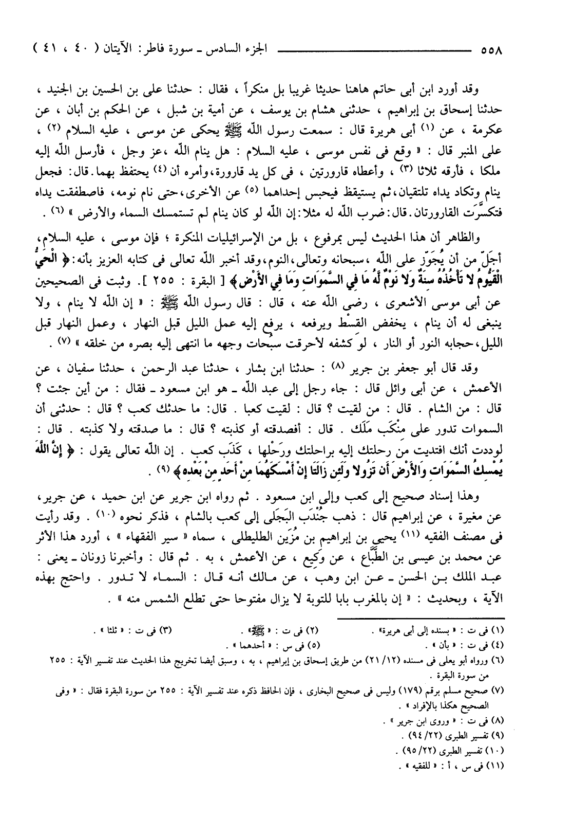 وَهَذَا إِسْنَادٌ صَحِيحٌ إِلَى كَعْبٍ وَإِلَى ابْنِ مَسْعُودٍ. ثُمَّ رَوَاهُ ابْنُ جَرِيرٍ عَنِ ابْنِ حُمَيْدٍ، عَنْ جَرِيرٍ، عَنْ مُغِيرَةَ، عَنْ إِبْرَاهِيمَ قَالَ: ذَهَبَ جُنْدب البَجَلي إِلَى كَعْبٍ بِالشَّامِ، فَذَكَرَ نَحْوَهُ. (10) وَقَدْ رَأَيْتُ فِي مُصَنَّفِ الْفَقِيهِ (11) يَحْيَى بْنِ إِبْرَاهِيمَ بْنِ مُزَين الطُّلَيْطِلِيِّ، سَمَّاهُ "سَيْرَ الْفُقَهَاءِ"، أَوْرَدَ هَذَا الْأَثَرَ عَنْ مُحَمَّدِ بْنِ عِيسَى بْنِ الطَّبَّاع، عَنْ وَكِيع، عَنِ الْأَعْمَشِ، بِهِ. ثُمَّ قَالَ: وَأَخْبَرَنَا زُونَانُ -يَعْنِي: عَبْدَ الْمَلِكِ بْنَ الْحَسَنِ-عَنِ ابْنِ وَهْبٍ، عَنْ مَالِكٍ أَنَّهُ قَالَ: السَّمَاءُ لَا تَدُورُ. وَاحْتَجَّ بِهَذِهِ الْآيَةِ، وَبِحَدِيثِ: "إِنَّ بِالْمَغْرِبِ بَابًا لِلتَّوْبَةِ لَا يَزَالُ مفتوحا حتى تطلع الشمس منه".