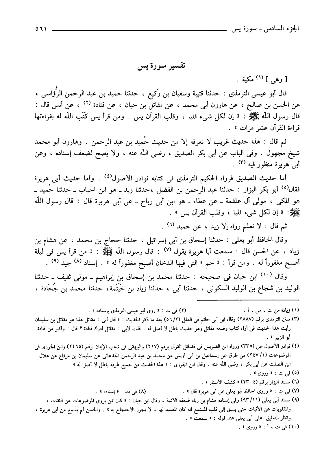 قَالَ أَبُو عِيسَى التِّرْمِذِيُّ: حَدَّثَنَا قُتَيْبَةُ وَسُفْيَانُ بْنُ وَكِيع، حَدَّثَنَا حُمَيْدُ بْنُ عَبْدِ الرَّحْمَنِ الرُّؤاسي، عَنِ الْحَسَنِ بْنِ صَالِحٍ، عَنْ هَارُونَ أَبِي مُحَمَّدٍ، عَنْ مُقَاتِلِ بْنِ حَيَّانَ، عَنْ قَتَادَةَ (2) ، عَنْ أَنَسٍ قَالَ: قَالَ رَسُولُ اللَّهِ صَلَّى اللَّهُ عَلَيْهِ وَسَلَّمَ: "إِنَّ لِكُلِّ شَيْءٍ قَلْبًا، وَقَلْبُ الْقُرْآنِ يس. ومَنْ قَرَأَ يس كَتَبَ اللَّهُ لَهُ بِقِرَاءَتِهَا قِرَاءَةَ الْقُرْآنِ عَشْرَ مَرَّاتٍ".