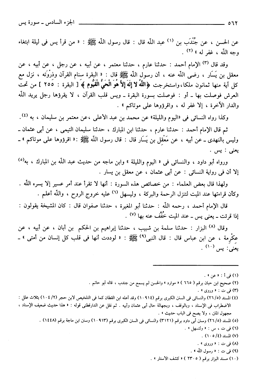 قَالَ الْإِمَامُ أَحْمَدُ، رَحِمَهُ اللَّهُ: حَدَّثَنَا أَبُو الْمُغِيرَةِ، حَدَّثَنَا صَفْوَانُ قَالَ: كَانَ الْمَشْيَخَةُ يَقُولُونَ: إِذَا قُرِئَتْ -يَعْنِي يس-عِنْدَ الْمَيِّتِ خُفِّف عَنْهُ بِهَا. (7)