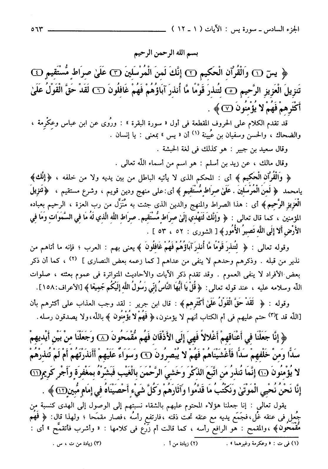 وَقَوْلُهُ تَعَالَى: {لِتُنْذِرَ قَوْمًا مَا أُنْذِرَ آبَاؤُهُمْ فَهُمْ غَافِلُونَ} يَعْنِي بِهِمُ: الْعَرَبَ؛ فَإِنَّهُ مَا أَتَاهُمْ مِنْ نَذِيرٍ مِنْ قَبْلِهِ. وَذِكْرُهُمْ وَحْدَهُمْ لَا يَنْفِي مَنْ عَدَاهُمْ [كَمَا زَعَمَهُ بَعْضُ النَّصَارَى] (2) ، كَمَا أَنَّ ذِكْرَ بَعْضِ الْأَفْرَادِ لَا يَنْفِي الْعُمُومَ. وَقَدْ تَقَدَّمَ ذِكْرُ الْآيَاتِ وَالْأَحَادِيثِ الْمُتَوَاتِرَةِ فِي عُمُومِ بَعْثَتِهِ، صَلَوَاتُ اللَّهِ وَسَلَامُهُ عَلَيْهِ، عِنْدَ قَوْلُهُ تَعَالَى: {قُلْ يَا أَيُّهَا النَّاسُ إِنِّي رَسُولُ اللَّهِ إِلَيْكُمْ جَمِيعًا} [الْأَعْرَافِ: 158] .