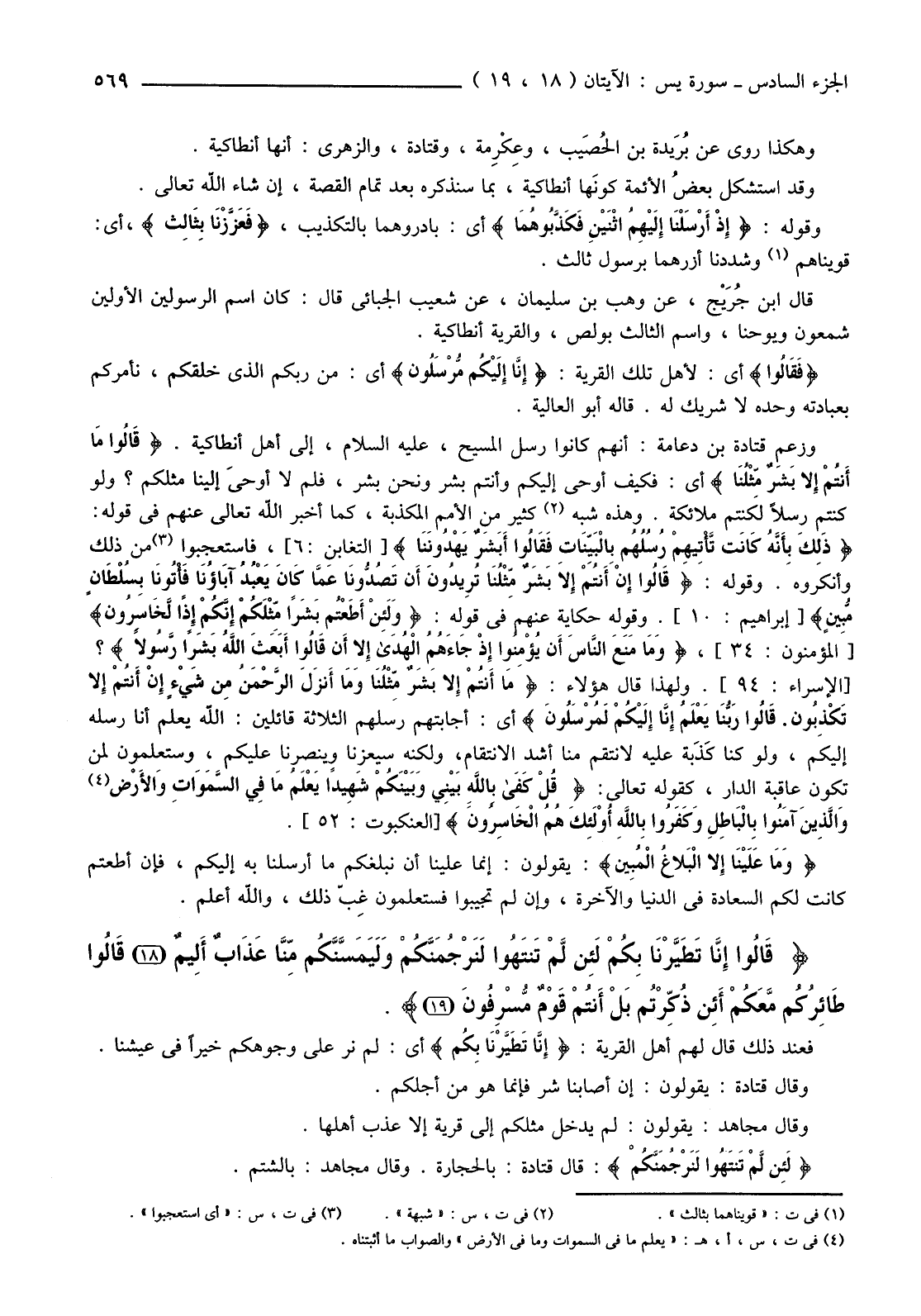 وَزَعَمَ قَتَادَةُ بْنُ دِعَامَةَ: أَنَّهُمْ كَانُوا رُسُلَ الْمَسِيحِ، عَلَيْهِ السَّلَامُ، إِلَى أَهْلِ أَنْطَاكِيَةَ. {قَالُوا مَا أَنْتُمْ إِلا بَشَرٌ مِثْلُنَا} أَيْ: فَكَيْفَ أوحيَ إِلَيْكُمْ وَأَنْتُمْ بَشَرٌ وَنَحْنُ بَشَرٌ، فَلِمَ لَا أوحيَ إِلَيْنَا مِثْلَكُمْ؟ وَلَوْ كُنْتُمْ رُسُلًا لَكُنْتُمْ مَلَائِكَةً. وَهَذِهِ شِبْهُ (2) كَثِيرٍ مِنَ الْأُمَمِ الْمُكَذِّبَةِ، كَمَا أَخْبَرَ اللَّهُ تَعَالَى عَنْهُمْ فِي قَوْلِهِ: {ذَلِكَ بِأَنَّهُ كَانَتْ تَأْتِيهِمْ رُسُلُهُمْ بِالْبَيِّنَاتِ فَقَالُوا أَبَشَرٌ يَهْدُونَنَا} [التَّغَابُنِ: 6] ، فَاسْتَعْجَبُوا (3) مِنْ ذَلِكَ وَأَنْكَرُوهُ. وَقَوْلُهُ: {قَالُوا إِنْ أَنْتُمْ إِلا بَشَرٌ مِثْلُنَا تُرِيدُونَ أَنْ تَصُدُّونَا عَمَّا كَانَ يَعْبُدُ آبَاؤُنَا فَأْتُونَا بِسُلْطَانٍ مُبِينٍ} [إِبْرَاهِيمَ: 10] . وَقَوْلُهُ حِكَايَةٌ عَنْهُمْ فِي قَوْلِهِ: {وَلَئِنْ أَطَعْتُمْ بَشَرًا مِثْلَكُمْ إِنَّكُمْ إِذًا لَخَاسِرُونَ} [الْمُؤْمِنُونَ: 34] ، {وَمَا مَنَعَ النَّاسَ أَنْ يُؤْمِنُوا إِذْ جَاءَهُمُ الْهُدَى إِلا أَنْ قَالُوا أَبَعَثَ اللَّهُ بَشَرًا رَسُولا} ؟ [الْإِسْرَاءِ: 94] . وَلِهَذَا قَالَ هَؤُلَاءِ: {مَا أَنْتُمْ إِلا بَشَرٌ مِثْلُنَا وَمَا أَنزلَ الرَّحْمَنُ مِنْ شَيْءٍ إِنْ أَنْتُمْ إِلا تَكْذِبُونَ * قَالُوا رَبُّنَا يَعْلَمُ إِنَّا إِلَيْكُمْ لَمُرْسَلُونَ} أَيْ: أَجَابَتْهُمْ رُسُلُهُمُ الثَّلَاثَةُ قَائِلِينَ: اللَّهُ يَعْلَمُ أَنَّا رُسُلُهُ إِلَيْكُمْ، وَلَوْ كُنَّا كَذَبة عَلَيْهِ لَانْتَقَمَ مِنَّا أَشَدَّ الِانْتِقَامِ، وَلَكِنَّهُ سَيُعِزُّنَا وَيَنْصُرُنَا عَلَيْكُمْ، وَسَتَعْلَمُونَ لِمَنْ تَكُونُ عَاقِبَةُ الدَّارِ، كَقَوْلِهِ تَعَالَى: {قُلْ كَفَى بِاللَّهِ بَيْنِي وَبَيْنَكُمْ شَهِيدًا يَعْلَمُ مَا فِي السَّمَوَاتِ وَالأرْضِ وَالَّذِينَ آمَنُوا بِالْبَاطِلِ وَكَفَرُوا بِاللَّهِ أُولَئِكَ هُمُ الْخَاسِرُونَ} [الْعَنْكَبُوتِ: 52] . (4)