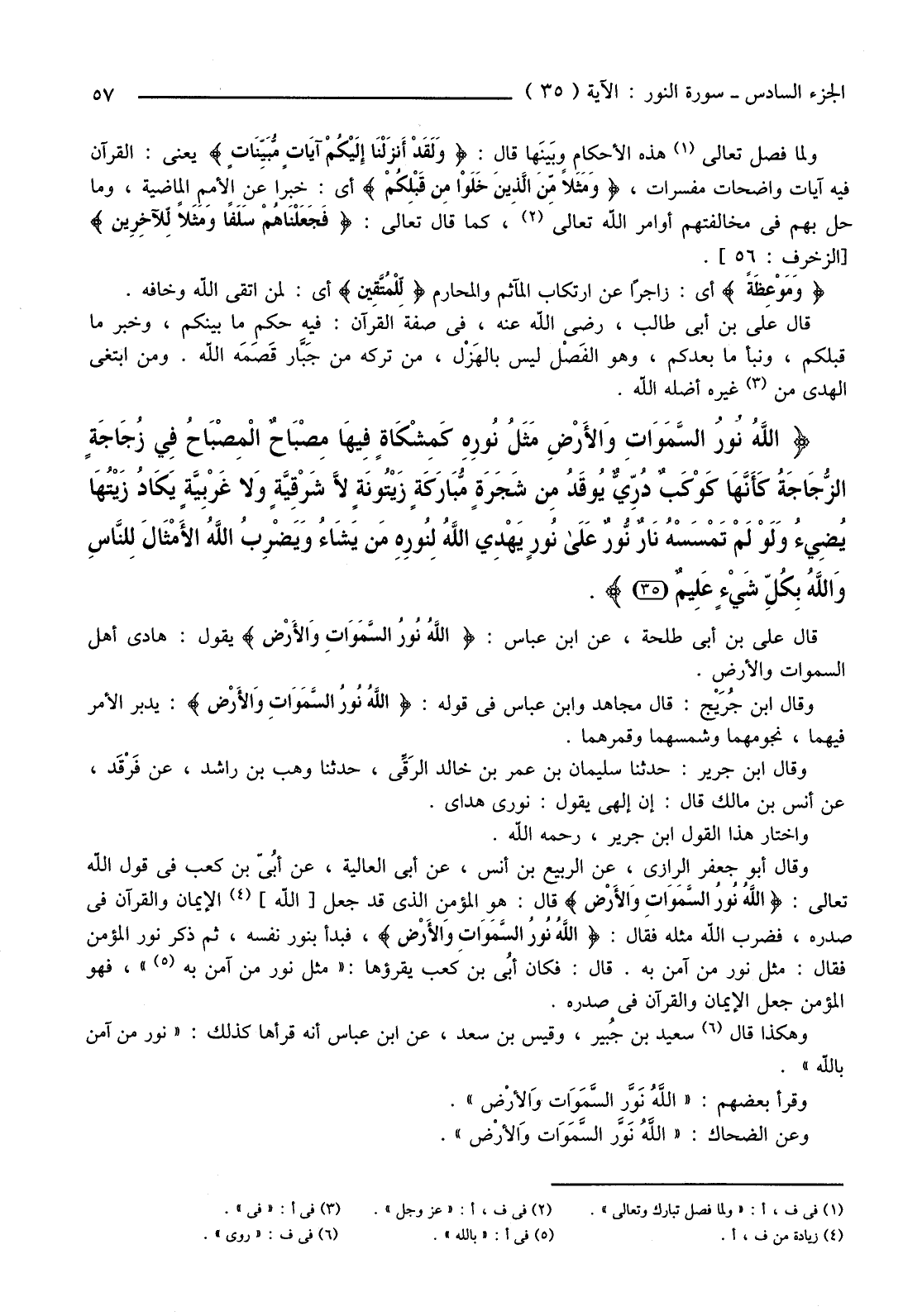 {اللَّهُ نُورُ السَّمَوَاتِ وَالأرْضِ مَثَلُ نُورِهِ كَمِشْكَاةٍ فِيهَا مِصْبَاحٌ الْمِصْبَاحُ فِي زُجَاجَةٍ الزُّجَاجَةُ كَأَنَّهَا كَوْكَبٌ دُرِّيٌّ يُوقَدُ مِنْ شَجَرَةٍ مُبَارَكَةٍ زَيْتُونَةٍ لَا شَرْقِيَّةٍ وَلا غَرْبِيَّةٍ يَكَادُ زَيْتُهَا يُضِيءُ وَلَوْ لَمْ تَمْسَسْهُ نَارٌ نُورٌ عَلَى نُورٍ يَهْدِي اللَّهُ لِنُورِهِ مَنْ يَشَاءُ وَيَضْرِبُ اللَّهُ الأمْثَالَ لِلنَّاسِ وَاللَّهُ بِكُلِّ شَيْءٍ عَلِيمٌ (35) }