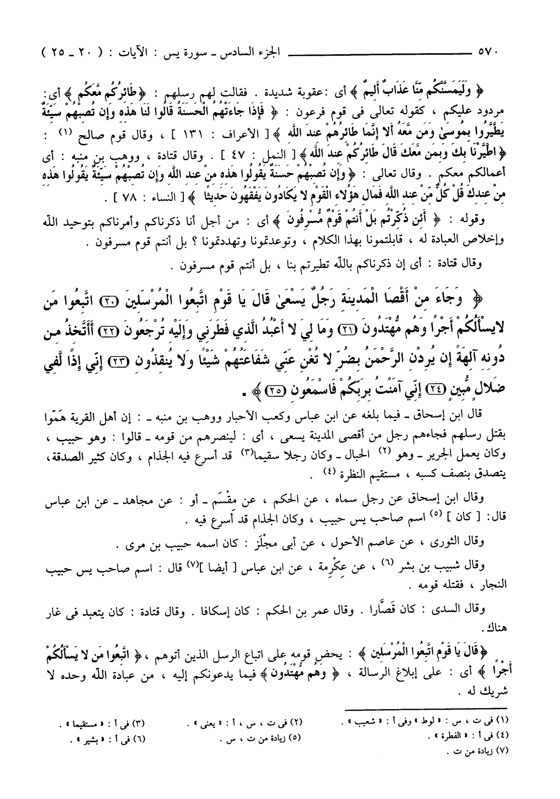 قَالَ ابْنُ إِسْحَاقَ -فِيمَا بَلَغَهُ عَنِ ابْنِ عَبَّاسٍ وَكَعْبِ الْأَحْبَارِ وَوَهْبِ بْنِ مُنَبِّهٍ-: إِنَّ أَهْلَ الْقَرْيَةِ هَمّوا بِقَتْلِ رُسُلِهِمْ فَجَاءَهُمْ رَجُلٌ مِنْ أَقْصَى الْمَدِينَةِ يَسْعَى، أَيْ: لِيَنْصُرَهُمْ مِنْ قَوْمِهِ -قَالُوا: وَهُوَ حَبِيبٌ، وَكَانَ يَعْمَلُ الْجَرِيرَ -وَهُوَ (2) الْحِبَالُ-وَكَانَ رَجُلًا سَقِيمًا (3) قَدْ أَسْرَعَ فِيهِ الْجُذَامُ، وَكَانَ كَثِيرَ الصَّدَقَةِ، يَتَصَدَّقُ بِنِصْفِ كَسْبِهِ، مُسْتَقِيمَ النَّظْرَةِ. (4)