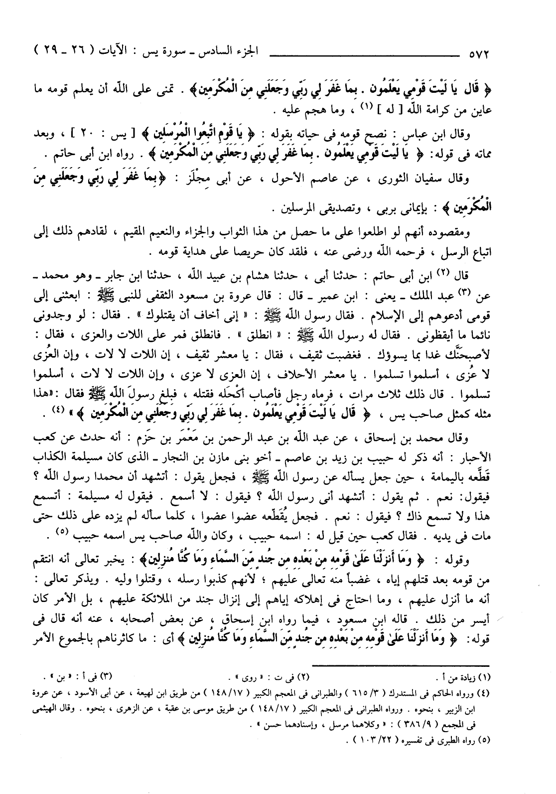 وَقَالَ ابْنُ عَبَّاسٍ: نَصَحَ قَوْمَهُ فِي حَيَاتِهِ بِقَوْلِهِ: {يَا قَوْمِ اتَّبِعُوا الْمُرْسَلِينَ} [يس: 20] ، وَبَعْدَ مَمَاتِهِ فِي قَوْلِهِ: {يَا لَيْتَ قَوْمِي يَعْلَمُونَ * بِمَا غَفَرَ لِي رَبِّي وَجَعَلَنِي مِنَ الْمُكْرَمِينَ} رَوَاهُ ابْنُ أَبِي حَاتِمٍ.