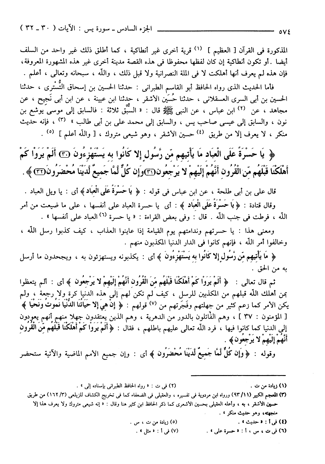 الْمَذْكُورَةَ فِي الْقُرْآنِ [الْعَظِيمِ] (1) قَرْيَةٌ أُخْرَى غَيْرُ أَنْطَاكِيَةَ، كَمَا أَطْلَقَ ذَلِكَ غَيْرُ وَاحِدٍ مِنَ السَّلَفِ أَيْضًا. أَوْ تَكُونُ أَنْطَاكِيَةُ إِنْ كَانَ لَفْظُهَا مَحْفُوظًا فِي هَذِهِ الْقِصَّةِ مَدِينَةً أُخْرَى غَيْرَ هَذِهِ الْمَشْهُورَةِ الْمَعْرُوفَةِ، فَإِنَّ هَذِهِ لَمْ يُعْرَفْ أَنَّهَا أُهْلِكَتْ لَا فِي الْمِلَّةِ النَّصْرَانِيَّةِ وَلَا قَبْلَ ذَلِكَ، وَاللَّهُ، سُبْحَانَهُ وَتَعَالَى، أَعْلَمُ.