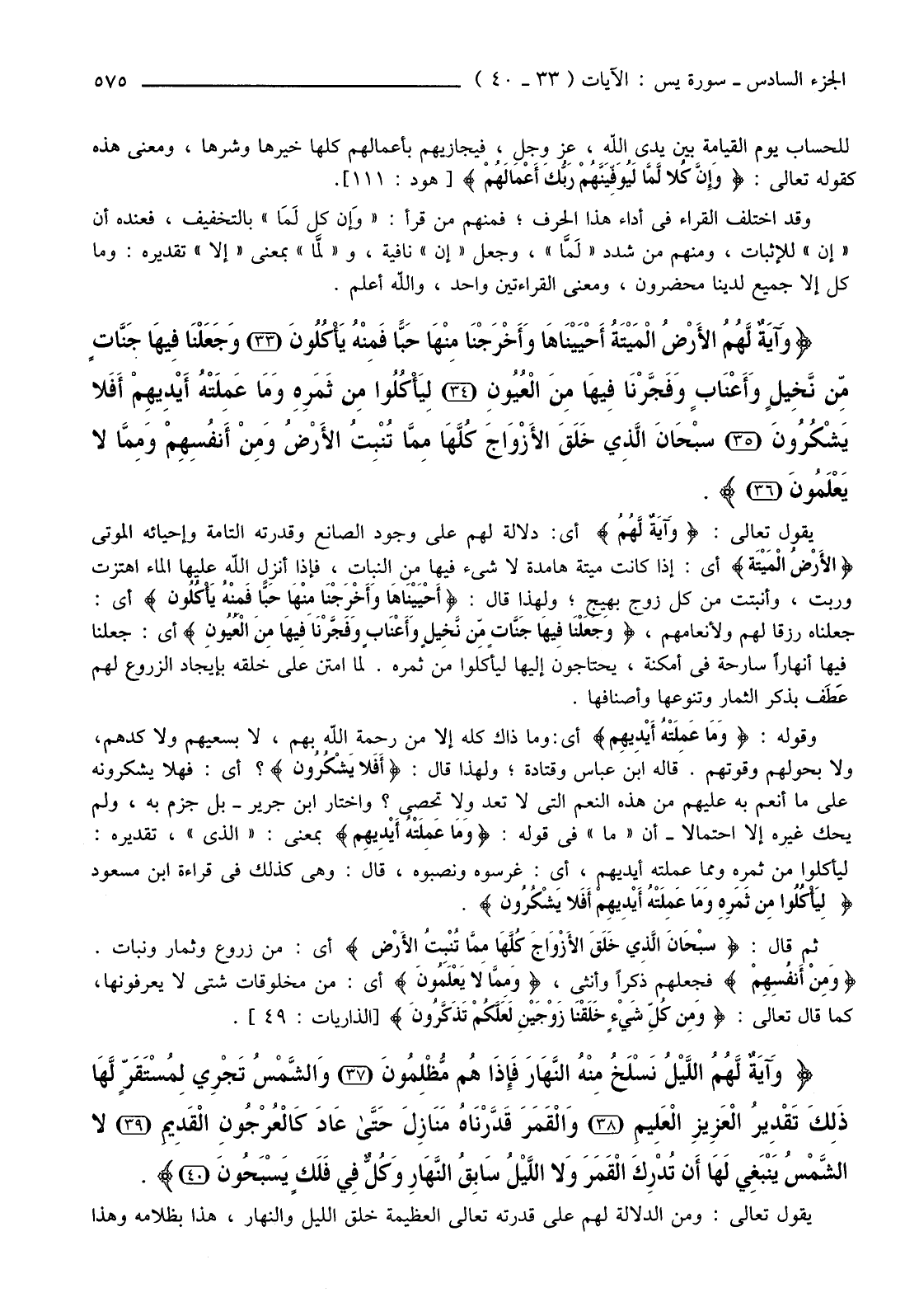 وَقَوْلُهُ: {وَمَا عَمِلَتْهُ أَيْدِيهِمْ} أَيْ: وَمَا ذَاكَ كُلُّهُ إِلَّا مِنْ رَحْمَةِ اللَّهِ بِهِمْ، لَا بِسَعْيِهِمْ وَلَا كَدِّهِمْ، وَلَا بِحَوْلِهِمْ وَقُوَّتِهِمْ. قَالَهُ ابْنُ عَبَّاسٍ وَقَتَادَةُ؛ وَلِهَذَا قَالَ: {أَفَلا يَشْكُرُونَ} ؟ أَيْ: فَهَلَا يَشْكُرُونَهُ عَلَى مَا أَنْعَمَ بِهِ عَلَيْهِمْ مِنْ هَذِهِ النِّعَمِ الَّتِي لَا تُعَدُّ وَلَا تُحْصَى؟ وَاخْتَارَ ابْنُ جَرِيرٍ -بَلْ جَزَمَ بِهِ، وَلَمْ يَحْكِ غَيْرُهُ إِلَّا احْتِمَالًا-أَنَّ "مَا" فِي قَوْلِهِ: {وَمَا عَمِلَتْهُ أَيْدِيهِمْ} بِمَعْنَى: "الَّذِي"، تَقْدِيرُهُ: لِيَأْكُلُوا مِنْ ثَمَرِهِ وَمِمَّا عَمِلَتْهُ أَيْدِيهِمْ، أَيْ: غَرَسُوهُ وَنَصَبُوهُ، قَالَ: وَهِيَ كَذَلِكَ فِي قِرَاءَةِ ابْنِ مَسْعُودٍ {لِيَأْكُلُوا مِنْ ثَمَرِهِ وَمَا عَمِلَتْهُ أَيْدِيهِمْ أَفَلا يَشْكُرُونَ} .