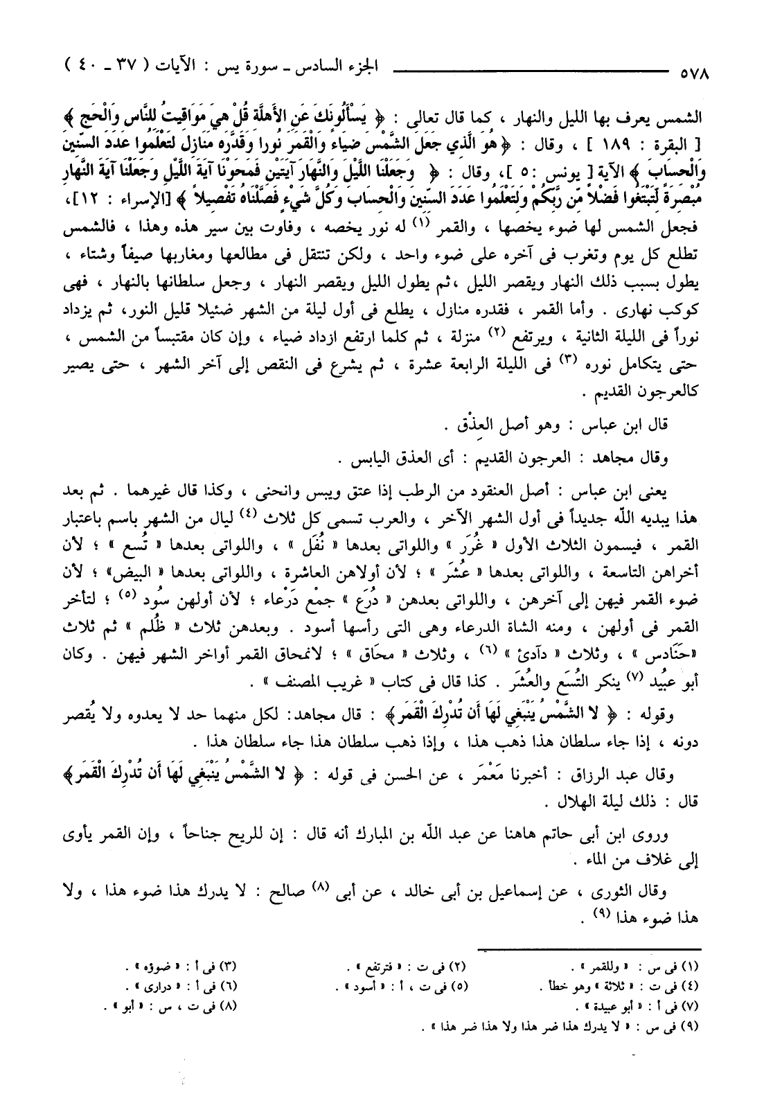 الشَّمْسَ يُعْرَفُ بِهَا اللَّيْلُ وَالنَّهَارُ، كَمَا قَالَ تَعَالَى: {يَسْأَلُونَكَ عَنِ الأهِلَّةِ قُلْ هِيَ مَوَاقِيتُ لِلنَّاسِ وَالْحَجِّ} [الْبَقَرَةِ: 189] ، وَقَالَ {هُوَ الَّذِي جَعَلَ الشَّمْسَ ضِيَاءً وَالْقَمَرَ نُورًا وَقَدَّرَهُ مَنَازِلَ لِتَعْلَمُوا عَدَدَ السِّنِينَ وَالْحِسَابَ} الْآيَةَ [يُونُسَ: 5] ، وَقَالَ: {وَجَعَلْنَا اللَّيْلَ وَالنَّهَارَ آيَتَيْنِ فَمَحَوْنَا آيَةَ اللَّيْلِ وَجَعَلْنَا آيَةَ النَّهَارِ مُبْصِرَةً لِتَبْتَغُوا فَضْلا مِنْ رَبِّكُمْ وَلِتَعْلَمُوا عَدَدَ السِّنِينَ وَالْحِسَابَ وَكُلَّ شَيْءٍ فَصَّلْنَاهُ تَفْصِيلا} [الْإِسْرَاءِ: 12] ، فَجَعَلَ الشَّمْسَ لَهَا ضَوْءٌ يَخُصُّهَا، وَالْقَمَرَ (1) لَهُ نُورٌ يَخُصُّهُ، وَفَاوَتَ بَيْنَ سَيْرِ هَذِهِ وَهَذَا، فَالشَّمْسُ تَطْلُعُ كُلَّ يَوْمٍ وَتَغْرُبُ فِي آخِرِهِ عَلَى ضَوْءٍ وَاحِدٍ، وَلَكِنْ تَنْتَقِلُ فِي مَطَالِعِهَا وَمَغَارِبِهَا صَيْفًا وَشِتَاءً، يَطُولُ بِسَبَبِ ذَلِكَ النَّهَارُ وَيَقْصُرُ اللَّيْلُ، ثُمَّ يَطُولُ اللَّيْلُ وَيَقْصُرُ النَّهَارُ، وَجَعَلَ سُلْطَانَهَا بِالنَّهَارِ، فَهِيَ كَوْكَبٌ نَهَارِيٌّ. وَأَمَّا الْقَمَرُ، فَقَدَّرَهُ مَنَازِلَ، يَطْلُعُ فِي أَوَّلِ لَيْلَةٍ مِنَ الشَّهْرِ ضَئِيلًا قَلِيلَ النُّورِ، ثُمَّ يَزْدَادُ نُورًا فِي اللَّيْلَةِ الثَّانِيَةِ، وَيَرْتَفِعُ (2) مَنْزِلَةً، ثُمَّ كَلَّمَا ارْتَفَعَ ازْدَادَ ضِيَاءً، وَإِنْ كَانَ مُقْتَبَسًا مِنَ الشَّمْسِ، حَتَّى يَتَكَامَلَ نُورُهُ (3) فِي اللَّيْلَةِ الرَّابِعَةَ عَشْرَةَ، ثُمَّ يَشْرَعُ فِي النَّقْصِ إِلَى آخِرِ الشَّهْرِ، حَتَّى يَصِيرَ كَالْعُرْجُونِ الْقَدِيمِ.