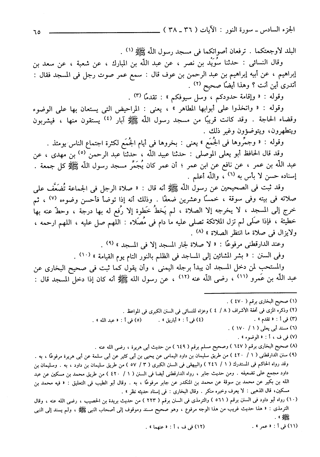 وَفِي السُّنَنِ: "بشِّر الْمَشَّائِينَ إِلَى الْمَسَاجِدِ فِي الظُّلَمِ بِالنُّورِ التَّامِّ يَوْمَ الْقِيَامَةِ" (10) .