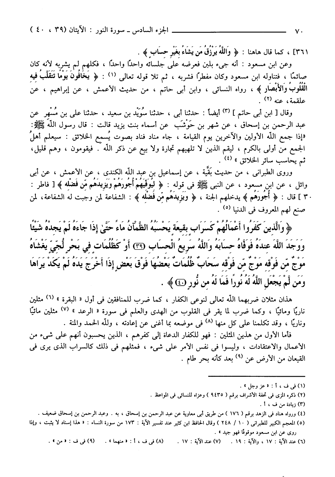 (5) المعجم الكبير للطبراني (10/248) وقال الحافظ ابن كثير عند تفسير الآية: 173 من سورة النساء: "هذا إِسْنَادٌ لَا يَثْبُتُ، وَإِذَا رُوِيَ عَنِ ابْنِ مسعود موقوفا فهو جيد".
