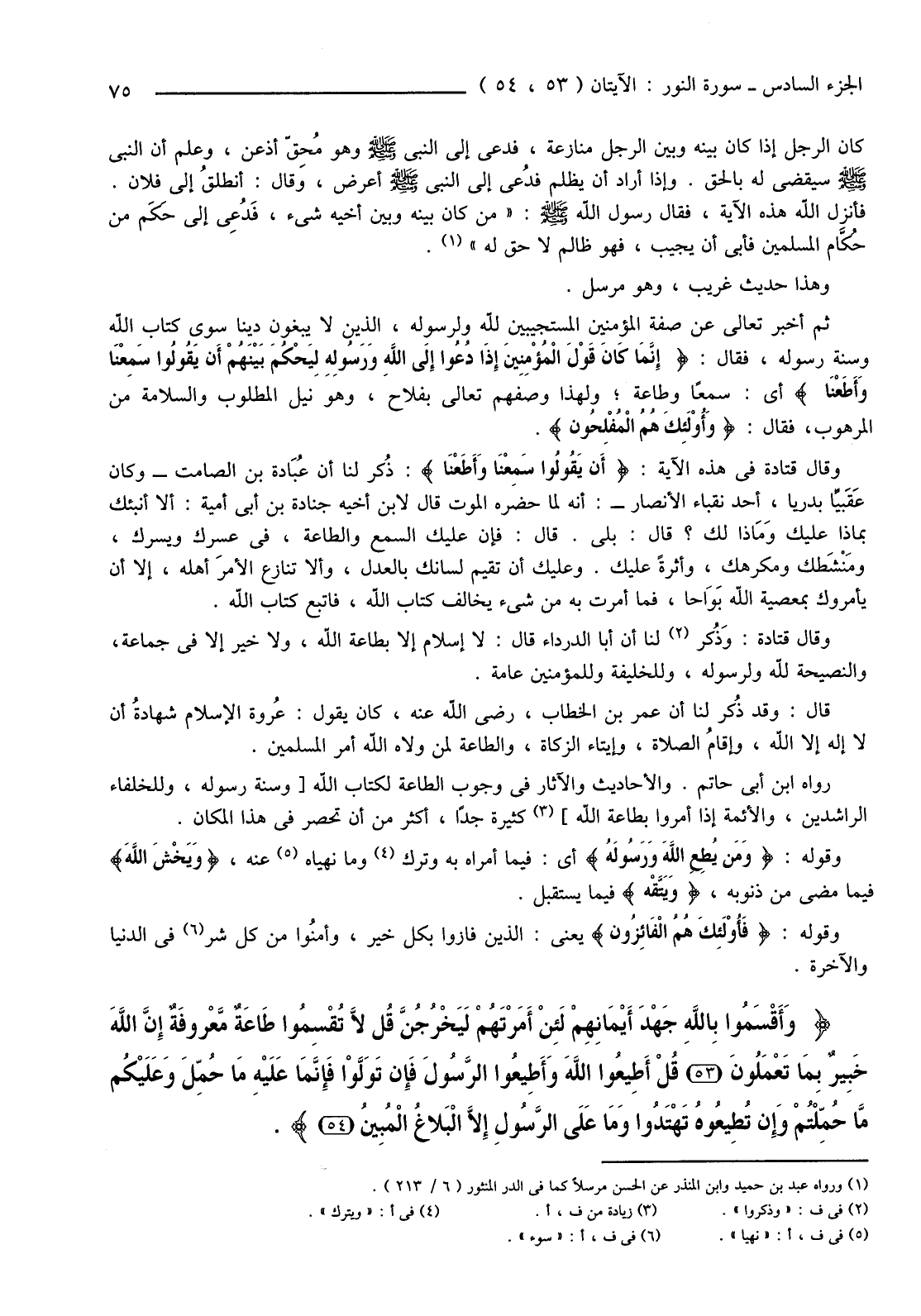 ثُمَّ أَخْبَرَ تَعَالَى عَنْ صِفَةِ الْمُؤْمِنِينَ الْمُسْتَجِيبِينَ لِلَّهِ وَلِرَسُولِهِ، الَّذِينَ لَا يَبْغُونَ دِينًا سِوَى كِتَابِ اللَّهِ وَسُنَّةِ رَسُولِهِ، فَقَالَ: {إِنَّمَا كَانَ قَوْلَ الْمُؤْمِنِينَ إِذَا دُعُوا إِلَى اللَّهِ وَرَسُولِهِ لِيَحْكُمَ بَيْنَهُمْ أَنْ يَقُولُوا سَمِعْنَا وَأَطَعْنَا} أَيْ: سَمْعًا وَطَاعَةً؛ وَلِهَذَا وَصْفَهُمْ تَعَالَى بِفَلَاحٍ، وَهُوَ نَيْلُ الْمَطْلُوبِ وَالسَّلَامَةُ مِنَ الْمَرْهُوبِ، فَقَالَ: {وَأُولَئِكَ هُمُ الْمُفْلِحُونَ} .