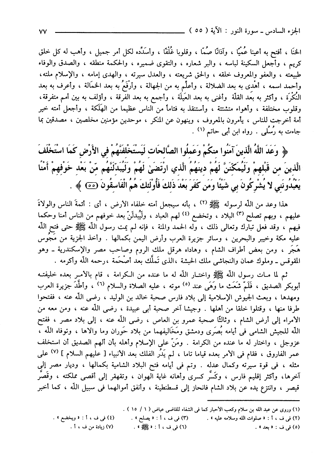 هَذَا وَعْدٌ مِنَ اللَّهِ لِرَسُولِهِ صَلَّى اللَّهُ عَلَيْهِ وَسَلَّمَ (2) . بِأَنَّهُ سَيَجْعَلُ أُمَّتَهُ خُلَفَاءَ الْأَرْضِ، أَيْ: أئمةَ النَّاسِ والولاةَ عَلَيْهِمْ، وَبِهِمْ تَصْلُحُ (3) الْبِلَادُ، وَتَخْضَعُ (4) لَهُمُ الْعِبَادُ، ولَيُبدلَنّ بَعْدَ خَوْفِهِمْ مِنَ النَّاسِ أَمْنًا وَحُكْمًا فِيهِمْ، وَقَدْ فَعَلَ تَبَارَكَ وَتَعَالَى ذَلِكَ. وَلَهُ الْحَمْدُ وَالْمِنَّةُ، فَإِنَّهُ لَمْ يَمُتْ رَسُولُ اللَّهِ صَلَّى اللَّهُ عَلَيْهِ وَسَلَّمَ حَتَّى فَتَحَ اللَّهُ عَلَيْهِ مَكَّةَ وَخَيْبَرَ وَالْبَحْرَيْنِ، وَسَائِرَ جَزِيرَةِ الْعَرَبِ وَأَرْضَ الْيَمَنِ بِكَمَالِهَا. وَأَخَذَ الْجِزْيَةَ مِنْ مَجُوس هَجَر، وَمِنْ بَعْضِ أَطْرَافِ الشَّامِ، وَهَادَاهُ هِرَقْلُ مَلِكُ الرُّومِ وَصَاحِبُ مِصْرَ وَالْإِسْكَنْدَرِيَّةِ -وَهُوَ الْمُقَوْقِسُ -وَمُلُوكُ عُمَانَ وَالنَّجَاشِيُّ مَلِكُ الْحَبَشَةِ، الَّذِي تَملَّك بَعْدَ أصْحَمة، رَحِمَهُ اللَّهُ وَأَكْرَمَهُ.