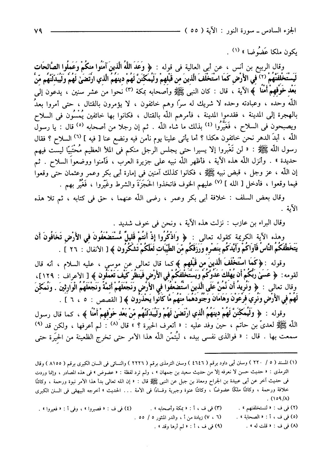 وَقَالَ الرَّبِيعِ بْنِ أَنَسٍ، عَنْ أَبِي الْعَالِيَةِ فِي قَوْلِهِ: {وَعَدَ اللَّهُ الَّذِينَ آمَنُوا مِنْكُمْ وَعَمِلُوا الصَّالِحَاتِ لَيَسْتَخْلِفَنَّهُمْ فِي الأرْضِ كَمَا اسْتَخْلَفَ الَّذِينَ مِنْ قَبْلِهِمْ وَلَيُمَكِّنَنَّ لَهُمْ دِينَهُمُ الَّذِي ارْتَضَى لَهُمْ وَلَيُبَدِّلَنَّهُمْ مِنْ بَعْدِ خَوْفِهِمْ أَمْنًا} (2) الْآيَةَ، قَالَ: كَانَ النَّبِيُّ صَلَّى اللَّهُ عَلَيْهِ وَسَلَّمَ وَأَصْحَابُهُ بِمَكَّةَ (3) نَحْوًا مِنْ عَشْرِ سِنِينَ، يَدْعُونَ إِلَى اللَّهِ وَحْدَهُ، وَعِبَادَتِهِ وَحْدَهُ لَا شَرِيكَ لَهُ سرًّا وَهُمْ خَائِفُونَ، لَا يُؤْمَرُونَ بِالْقِتَالِ، حَتَّى أُمِرُوا بعدُ بِالْهِجْرَةِ إِلَى الْمَدِينَةِ، فَقَدِمُوا الْمَدِينَةَ، فَأَمَرَهُمُ اللَّهُ بِالْقِتَالِ، فَكَانُوا بِهَا خَائِفِينَ يُمْسُون فِي السِّلَاحِ ويصبحون في السلاح، فَغَيَّرُوا (4) بِذَلِكَ مَا شَاءَ اللَّهُ. ثُمَّ إِنَّ رَجُلًا مِنْ أَصْحَابِهِ (5) قَالَ: يَا رَسُولَ اللَّهِ، أبدَ الدَّهْرِ نَحْنُ خَائِفُونَ هَكَذَا؟ أَمَا يَأْتِي عَلَيْنَا يَوْمٌ نَأْمَنُ فِيهِ وَنَضَعُ عَنَّا [فِيهِ] (6) السِّلَاحَ؟ فَقَالَ رَسُولُ اللَّهِ صَلَّى اللَّهُ عَلَيْهِ وَسَلَّمَ: " لَنْ تَغْبروا إِلَّا يَسِيرًا حَتَّى يَجْلِسَ الرَّجُلُ مِنْكُمْ فِي الْمَلَأِ الْعَظِيمِ مُحْتَبِيًا لَيْسَتْ فِيهِمْ حَدِيدَةٌ". وَأَنْزَلَ اللَّهُ هَذِهِ الْآيَةَ، فَأَظْهَرَ اللَّهُ نَبِيَّهُ عَلَى جَزِيرَةِ الْعَرَبِ، فَأَمِنُوا وَوَضَعُوا السِّلَاحَ. ثُمَّ إِنَّ اللَّهَ، عَزَّ وَجَلَّ، قَبَضَ نَبِيَّهُ صَلَّى اللَّهُ عَلَيْهِ وَسَلَّمَ فَكَانُوا كَذَلِكَ آمِنِينَ فِي إِمَارَةِ أَبِي بَكْرٍ وَعُمَرَ وَعُثْمَانَ حَتَّى وَقَعُوا فِيمَا وَقَعُوا، فَأَدْخَلَ [اللَّهُ] (7) عَلَيْهِمُ الْخَوْفَ فَاتَّخَذُوا الحَجَزَةَ وَالشُّرَطَ وغَيّروا، فَغُيَّر بِهِمْ.