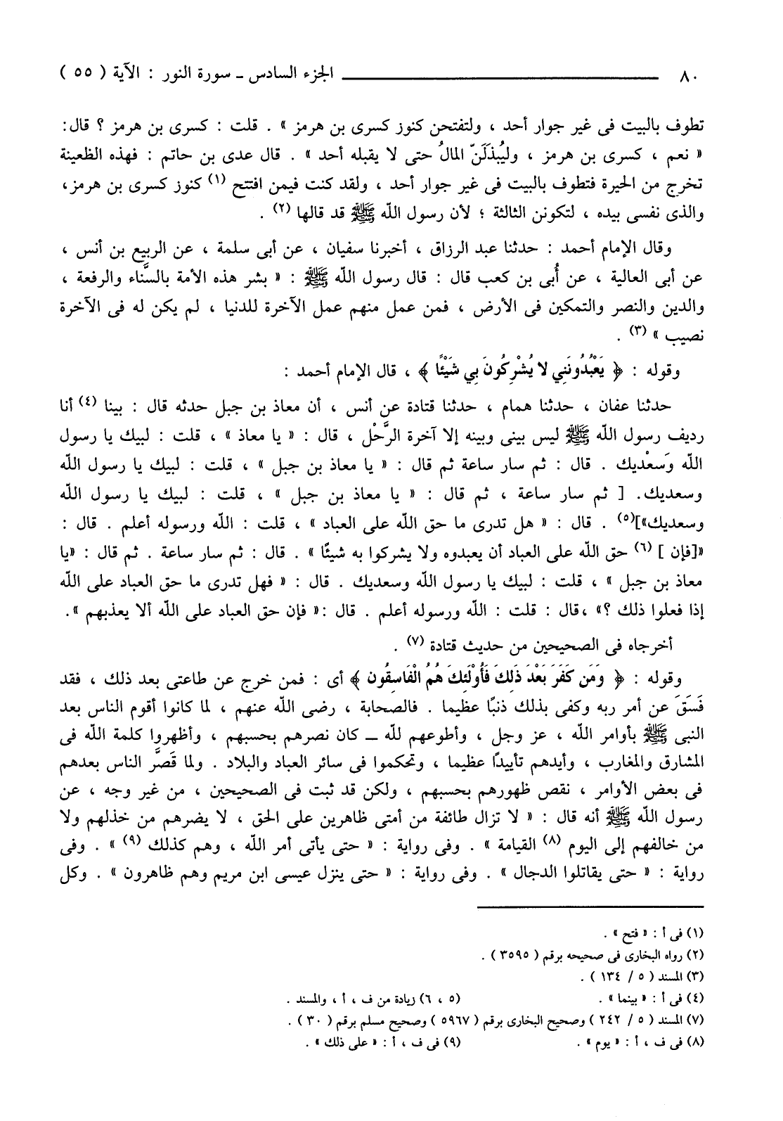 وَقَوْلُهُ: {يَعْبُدُونَنِي لَا يُشْرِكُونَ بِي شَيْئًا} قَالَ الْإِمَامُ أَحْمَدُ: