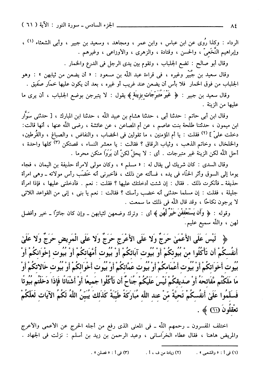 {لَيْسَ عَلَى الأعْمَى حَرَجٌ وَلا عَلَى الأعْرَجِ حَرَجٌ وَلا عَلَى الْمَرِيضِ حَرَجٌ وَلا عَلَى أَنْفُسِكُمْ أَنْ تَأْكُلُوا مِنْ بُيُوتِكُمْ أَوْ بُيُوتِ آبَائِكُمْ أَوْ بُيُوتِ أُمَّهَاتِكُمْ أَوْ بُيُوتِ إِخْوَانِكُمْ أَوْ بُيُوتِ أَخَوَاتِكُمْ أَوْ بُيُوتِ أَعْمَامِكُمْ أَوْ بُيُوتِ عَمَّاتِكُمْ أَوْ بُيُوتِ أَخْوَالِكُمْ أَوْ بُيُوتِ خَالاتِكُمْ أَوْ مَا مَلَكْتُمْ مَفَاتِحَهُ أَوْ صَدِيقِكُمْ لَيْسَ عَلَيْكُمْ جُنَاحٌ أَنْ تَأْكُلُوا جَمِيعًا أَوْ أَشْتَاتًا فَإِذَا دَخَلْتُمْ بُيُوتًا فَسَلِّمُوا عَلَى أَنْفُسِكُمْ تَحِيَّةً مِنْ عِنْدِ اللَّهِ مُبَارَكَةً طَيِّبَةً كَذَلِكَ يُبَيِّنُ اللَّهُ لَكُمُ الآيَاتِ لَعَلَّكُمْ تَعْقِلُونَ (61) }