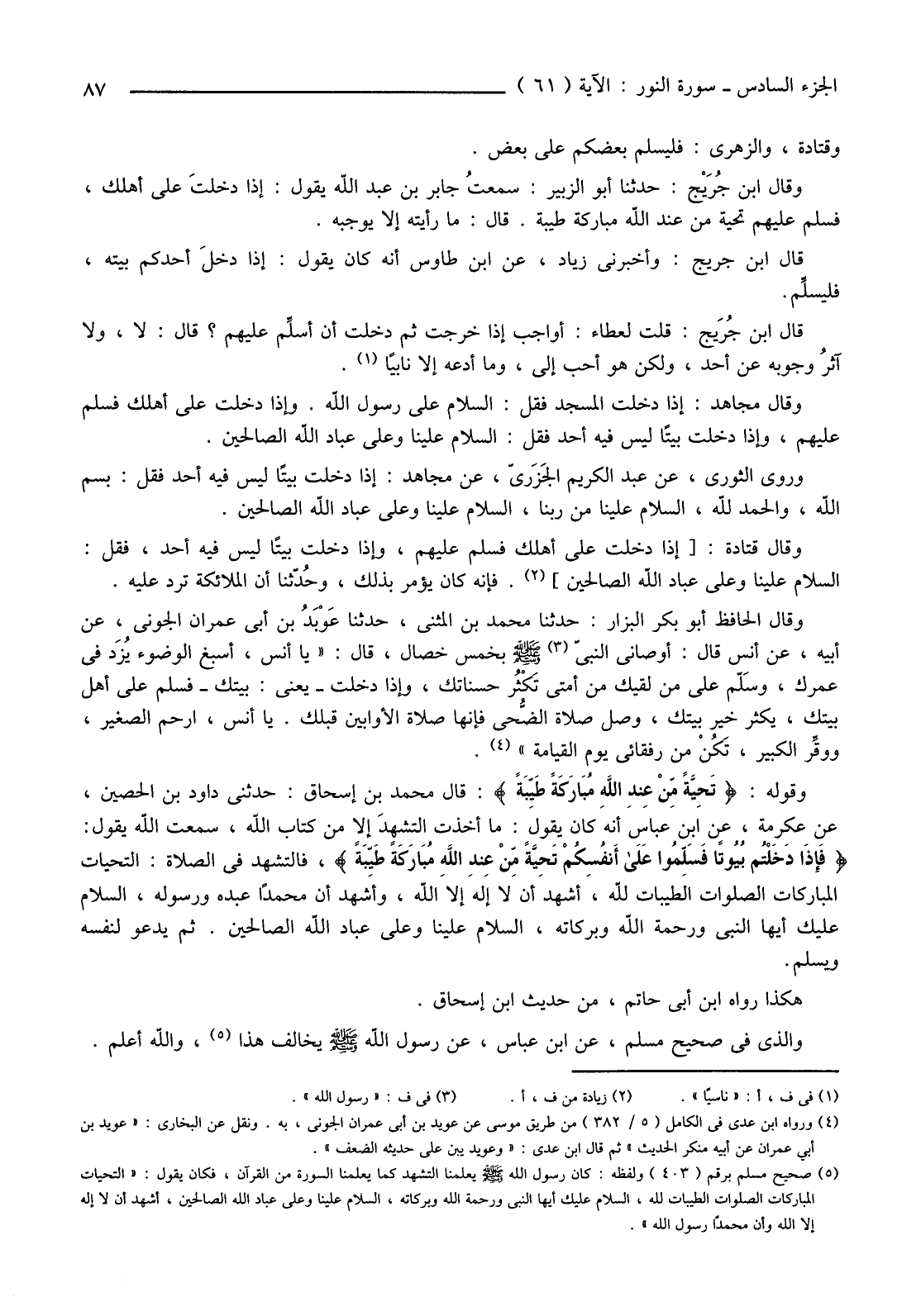 قَالَ ابْنُ جُرَيْج: قُلْتُ لِعَطَاءٍ: أَوَاجِبٌ إِذَا خَرَجْتُ ثُمَّ دَخَلْتُ أَنْ أسلِّم عَلَيْهِمْ؟ قَالَ: لَا وَلَا آثِرُ وُجُوبَهُ عَنْ أَحَدٍ، وَلَكِنْ هُوَ أحبُّ إِلَيَّ، وَمَا أَدَعُهُ إلا نابيًا (1)