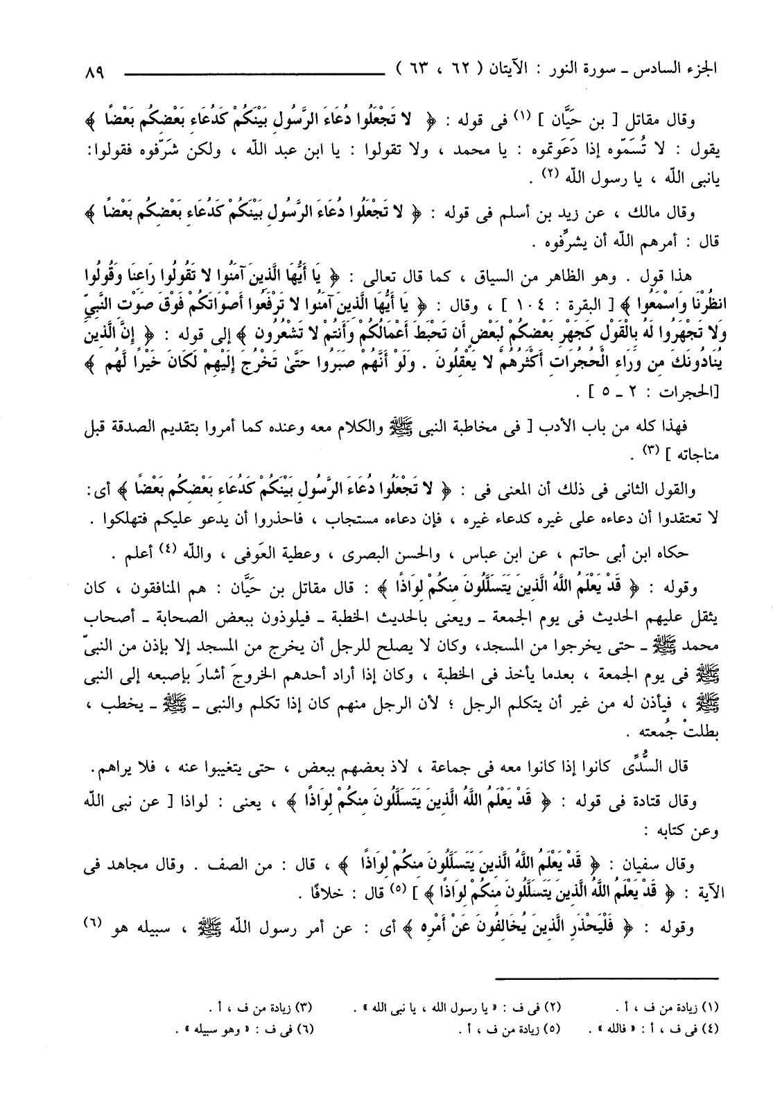 وَقَالَ مُقَاتِلُ [بْنُ حَيَّان] (1) فِي قَوْلِهِ: {لَا تَجْعَلُوا دُعَاءَ الرَّسُولِ بَيْنَكُمْ كَدُعَاءِ بَعْضِكُمْ بَعْضًا} يَقُولُ: لَا تُسَمّوه إِذَا دَعَوتموه: يَا مُحَمَّدُ، وَلَا تَقُولُوا: يَا بْنَ عَبْدِ اللَّهِ، وَلَكِنْ شَرّفوه فَقُولُوا: يَا نَبِيَّ اللَّهِ، يَا رَسُولَ اللَّهِ (2) .