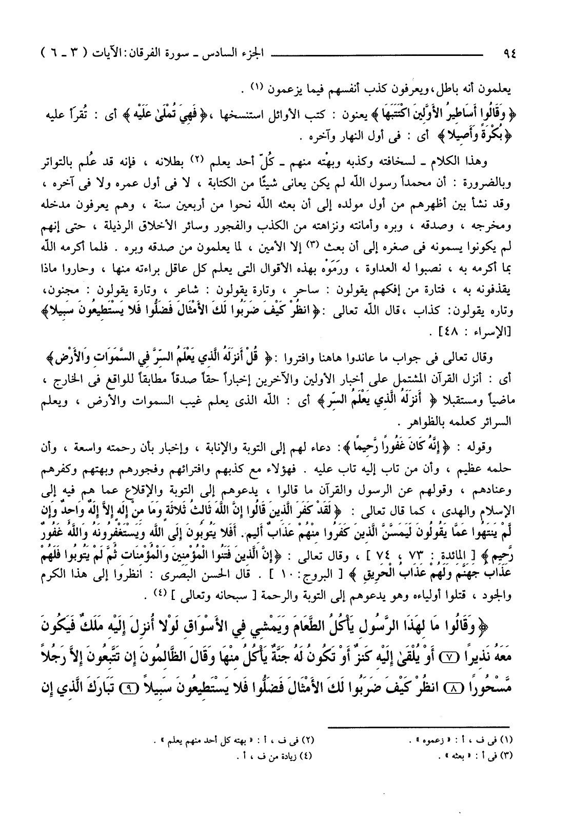 {وَقَالُوا مَالِ هَذَا الرَّسُولِ يَأْكُلُ الطَّعَامَ وَيَمْشِي فِي الأسْوَاقِ لَوْلا أُنزلَ إِلَيْهِ مَلَكٌ فَيَكُونَ مَعَهُ نَذِيرًا (7) أَوْ يُلْقَى إِلَيْهِ كَنز أَوْ تَكُونُ لَهُ جَنَّةٌ يَأْكُلُ مِنْهَا وَقَالَ الظَّالِمُونَ إِنْ تَتَّبِعُونَ إِلا رَجُلا مَسْحُورًا (8) انْظُرْ كَيْفَ ضَرَبُوا لَكَ الأمْثَالَ فَضَلُّوا فَلا يَسْتَطِيعُونَ سَبِيلا (9) تَبَارَكَ الَّذِي إِنْ شَاءَ جَعَلَ لَكَ خَيْرًا مِنْ ذَلِكَ جَنَّاتٍ تَجْرِي مِنْ تَحْتِهَا الأنْهَارُ وَيَجْعَلْ لَكَ قُصُورًا (10) بَلْ كَذَّبُوا بِالسَّاعَةِ وَأَعْتَدْنَا لِمَنْ كَذَّبَ بِالسَّاعَةِ سَعِيرًا (11) }