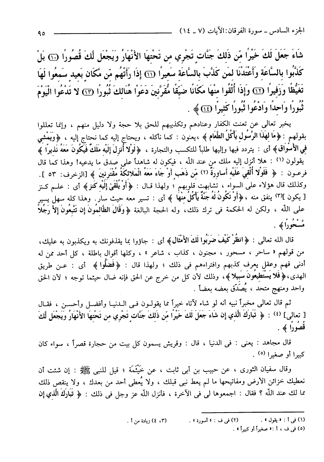 وَقَالَ سُفْيَانُ الثَّوْرِيُّ، عَنْ حَبِيبِ بْنِ أَبِي ثَابِتٍ، عَنْ خَيْثَمَة؛ قِيلَ لِلنَّبِيِّ صَلَّى اللَّهُ عَلَيْهِ وَسَلَّمَ: إِنْ شِئْتَ أَنْ نُعْطِيَكَ خَزَائِنَ الْأَرْضِ وَمَفَاتِيحَهَا مَا لَمْ يُعْطَ نَبِيٌّ قَبْلَكَ، وَلَا يُعطى أَحَدٌ مِنْ بَعْدِكَ، وَلَا يَنْقُصُ ذَلِكَ مِمَّا لَكَ عِنْدَ اللَّهِ؟ فَقَالَ: اجْمَعُوهَا لِي فِي الْآخِرَةِ، فَأَنْزَلَ اللَّهُ عَزَّ وَجَلَّ فِي ذَلِكَ: {تَبَارَكَ الَّذِي إِنْ شَاءَ جَعَلَ لَكَ خَيْرًا مِنْ ذَلِكَ جَنَّاتٍ تَجْرِي مِنْ تَحْتِهَا الأنْهَارُ وَيَجْعَلْ لَكَ قُصُورًا} (5) .