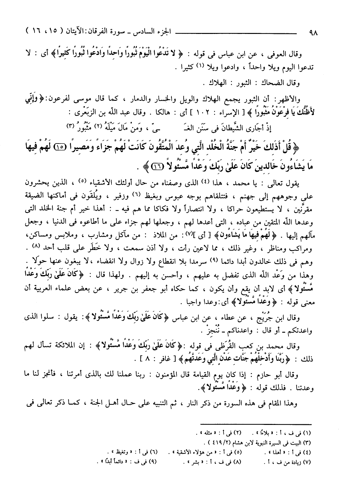 {قُلْ أَذَلِكَ خَيْرٌ أَمْ جَنَّةُ الْخُلْدِ الَّتِي وُعِدَ الْمُتَّقُونَ كَانَتْ لَهُمْ جَزَاءً وَمَصِيرًا (15) لَهُمْ فِيهَا مَا يَشَاءُونَ خَالِدِينَ كَانَ عَلَى رَبِّكَ وَعْدًا مَسْئُولا (16) } .