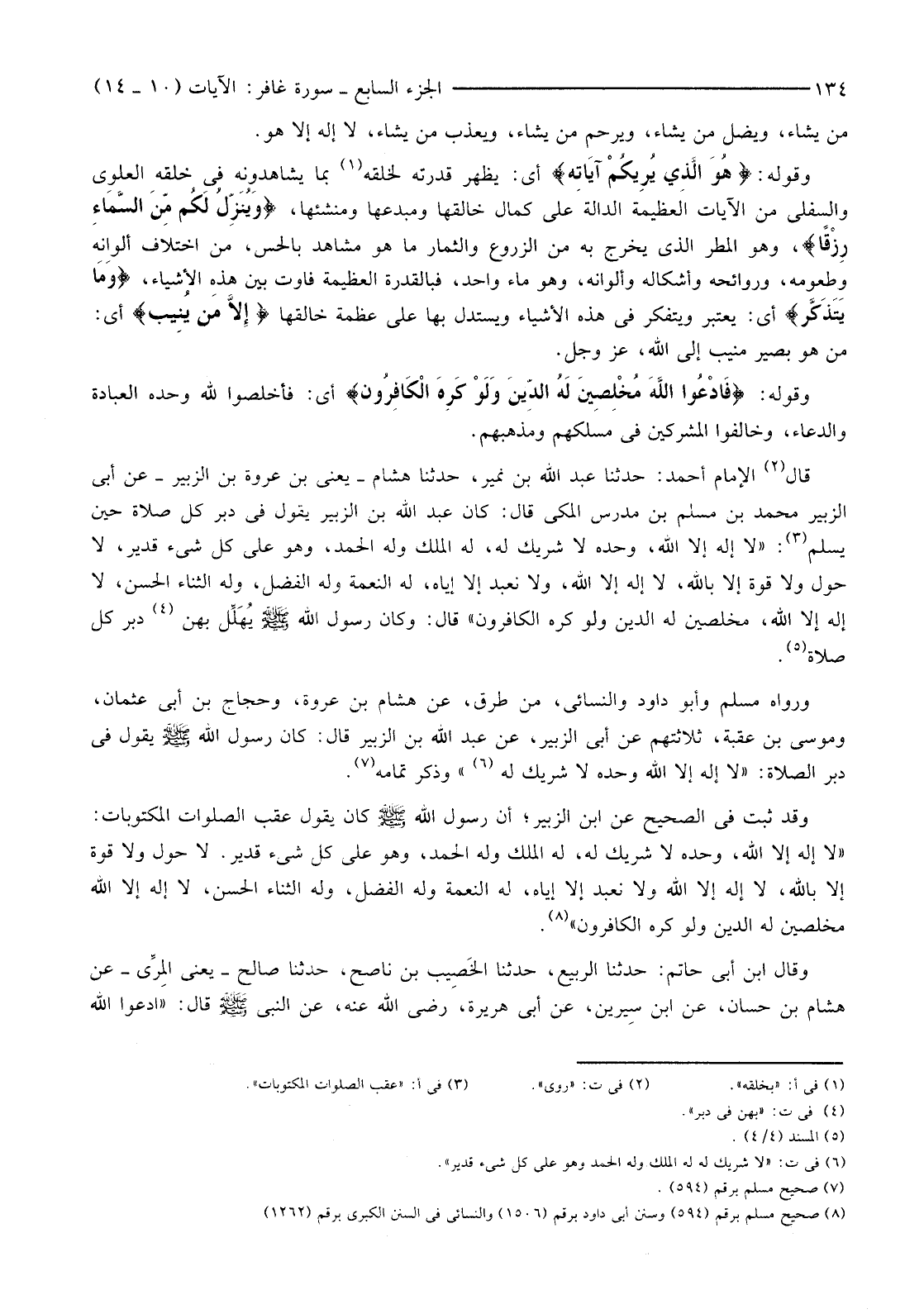 وَقَدْ ثَبَتَ فِي الصَّحِيحِ عَنِ ابْنِ الزُّبَيْرِ؛ أَنَّ رَسُولَ اللَّهِ صَلَّى اللَّهُ عَلَيْهِ وَسَلَّمَ كَانَ يَقُولُ عَقِبَ الصَّلَوَاتِ الْمَكْتُوبَاتِ: "لَا إِلَهَ إِلَّا اللَّهُ، وَحْدَهُ لَا شَرِيكَ لَهُ، لَهُ الْمُلْكُ وَلَهُ الْحَمْدُ، وَهُوَ عَلَى كُلِّ شَيْءٍ قَدِيرٌ. لَا حَوْلَ وَلَا قُوَّةَ إِلَّا بِاللَّهِ، لَا إِلَهَ إِلَّا اللَّهُ وَلَا نَعْبُدُ إِلَّا إِيَّاهُ، لَهُ النِّعْمَةُ وَلَهُ الْفَضْلُ، وَلَهُ الثَّنَاءُ الْحَسَنُ، لَا إِلَهَ إِلَّا اللَّهُ مُخْلِصِينَ لَهُ الدِّينَ وَلَوْ كَرِهَ الْكَافِرُونَ" (8) .