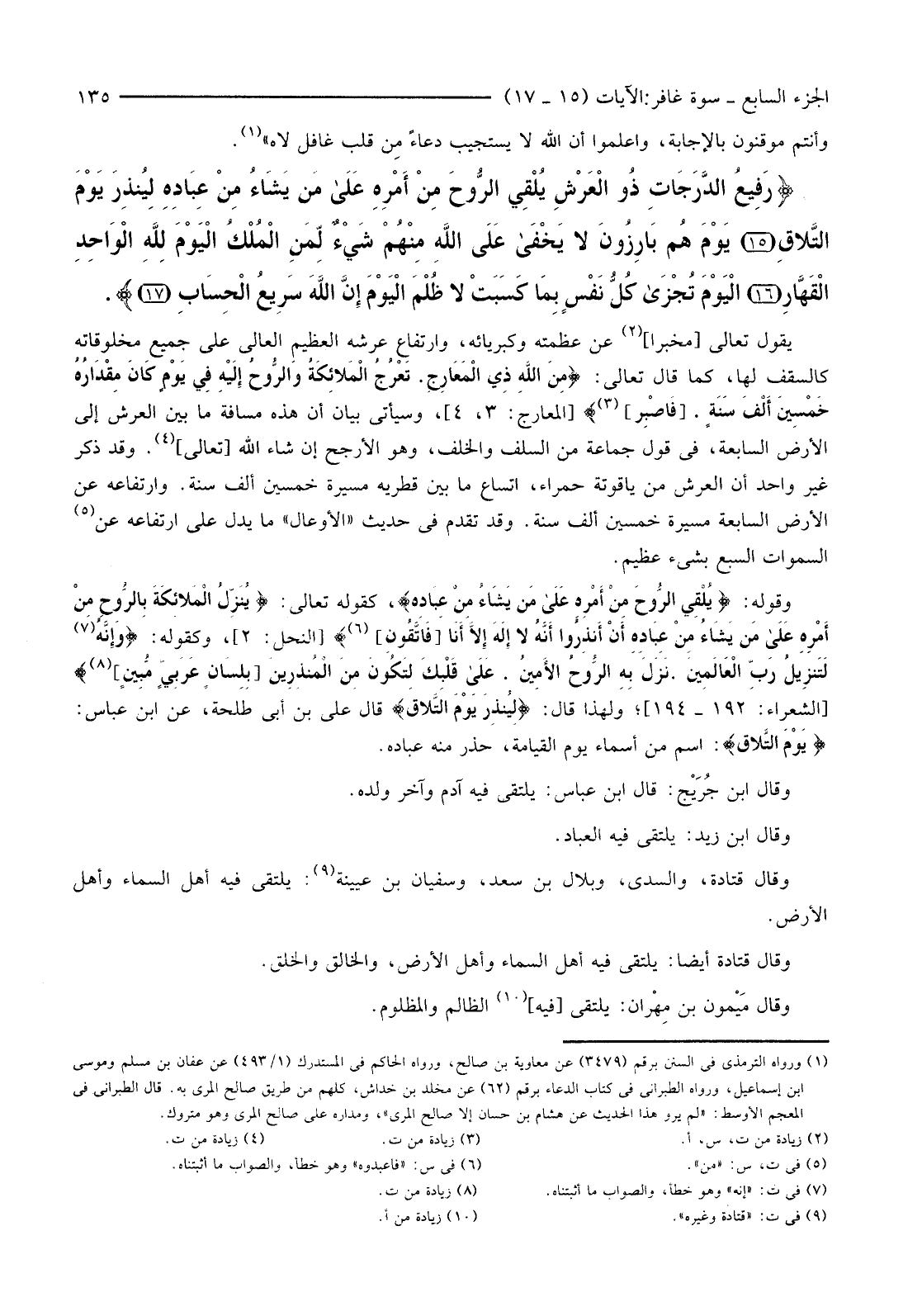 وَقَوْلُهُ: {يُلْقِي الرُّوحَ مِنْ أَمْرِهِ عَلَى مَنْ يَشَاءُ مِنْ عِبَادِهِ} كَقَوْلِهِ تَعَالَى: {يُنزلُ الْمَلائِكَةَ بِالرُّوحِ مِنْ أَمْرِهِ عَلَى مَنْ يَشَاءُ مِنْ عِبَادِهِ أَنْ أَنْذِرُوا أَنَّهُ لَا إِلَهَ إِلا أَنَا [فَاتَّقُونِ] } [النَّحْلِ: 2] (5) ، وَكَقَوْلِهِ: {وَإِنَّهُ لَتَنزيلُ رَبِّ الْعَالَمِينَ. نزلَ بِهِ الرُّوحُ الأمِينُ. عَلَى قَلْبِكَ لِتَكُونَ مِنَ الْمُنْذِرِينَ. [بِلِسَانٍ عَرَبِيٍّ مُبِين] } [الشُّعَرَاءِ: 192 -194] (6) (7) ؛ وَلِهَذَا قَالَ: {لِيُنْذِرَ يَوْمَ التَّلاقِ} قَالَ عَلِيُّ بْنُ أَبِي طَلْحَةَ، عَنِ ابْنِ عَبَّاسٍ: {يَوْمَ التَّلاقِ} اسْمٌ مِنْ أَسْمَاءِ يَوْمِ الْقِيَامَةِ، حَذَّرَ مِنْهُ عِبَادَهُ.