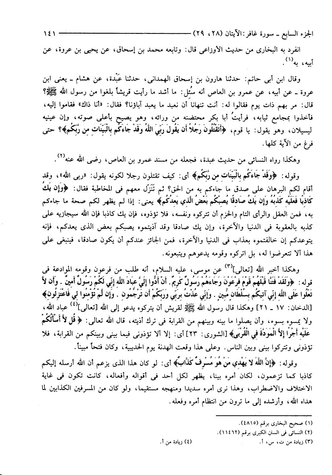 وَقَالَ ابْنُ أَبِي حَاتِمٍ: حَدَّثَنَا هَارُونُ بْنُ إِسْحَاقَ الْهَمْدَانِيُّ، حَدَّثَنَا عَبْدة عَنْ هِشَامٍ -يَعْنِي ابْنَ عُرْوَةَ-عَنْ أَبِيهِ، عَنْ عَمْرِو بْنِ الْعَاصِ أَنَّهُ سُئِل: مَا أَشَدُّ مَا رَأَيْتَ قُرَيْشًا بَلَغُوا مِنْ رَسُولِ اللَّهِ صَلَّى اللَّهُ عَلَيْهِ وَسَلَّمَ؟ قال: مَرَّ بِهِمْ ذَاتَ يَوْمٍ فَقَالُوا لَهُ: أَنْتَ تَنْهَانَا أَنْ نَعْبُدَ مَا يَعْبُدُ آبَاؤُنَا؟ فَقَالَ: "أَنَا ذَاكَ" فَقَامُوا إِلَيْهِ، فَأَخَذُوا بِمَجَامِعِ ثِيَابِهِ، فرأيتُ أَبَا بَكْرٍ مُحْتَضِنُهُ مِنْ وَرَائِهِ، وَهُوَ يَصِيحُ بِأَعْلَى صَوْتِهِ، وَإِنَّ عَيْنَيْهِ لَيَسِيلَانِ، وَهُوَ يَقُولُ: يَا قَوْمِ، {أَتَقْتُلُونَ رَجُلا أَنْ يَقُولَ رَبِّيَ اللَّهُ وَقَدْ جَاءَكُمْ بِالْبَيِّنَاتِ مِنْ رَبِّكُمْ} حَتَّى فَرَغَ مِنَ الْآيَةِ كُلِّهَا.