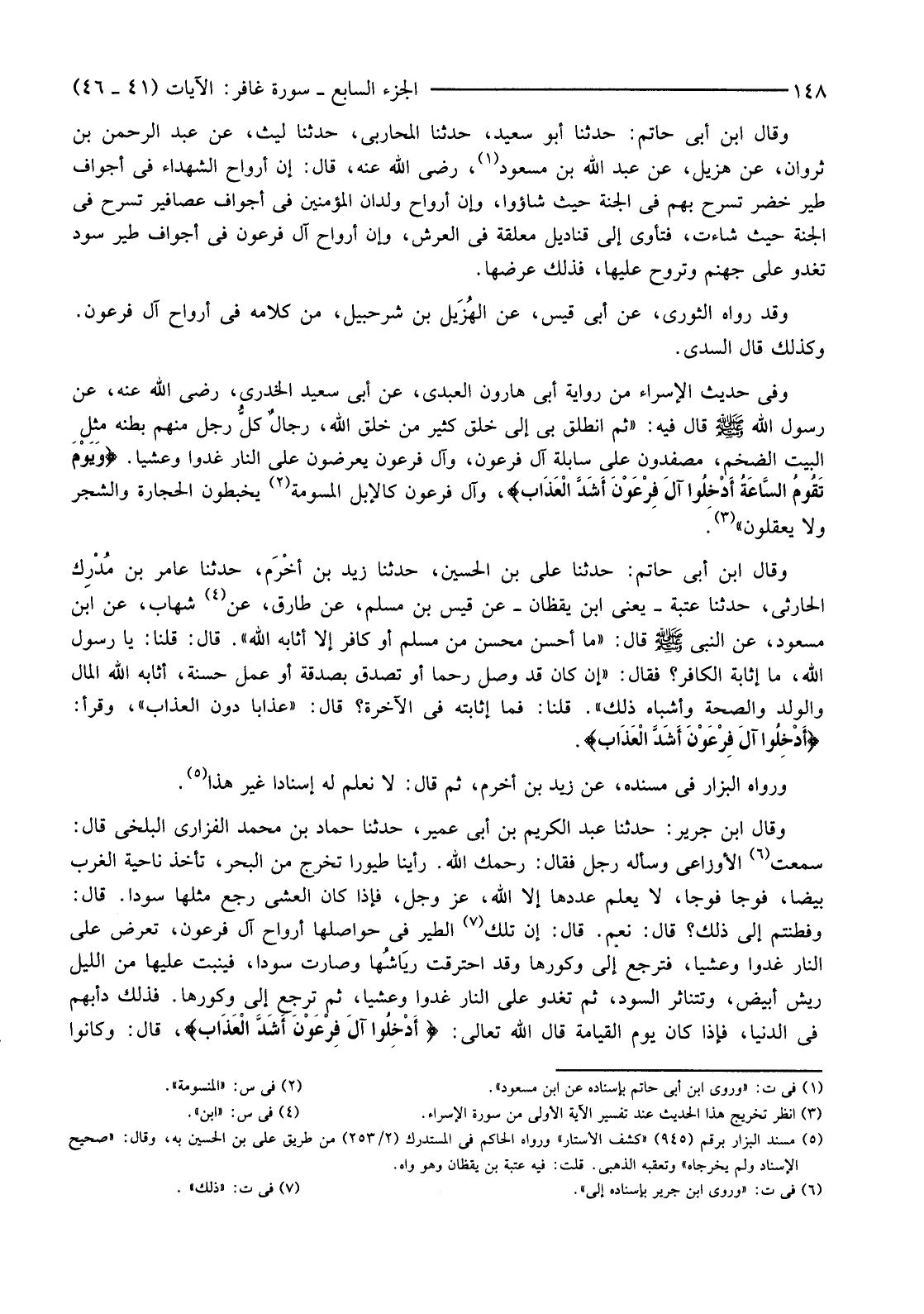 وَقَدْ رَوَاهُ الثَّوْرِيُّ عَنْ أبي قيس عن الهُزَيل ابن شُرَحْبِيلَ، مِنْ كَلَامِهِ فِي أَرْوَاحِ آلِ فِرْعَوْنَ. وَكَذَلِكَ قَالَ السُّدِّيُّ.
