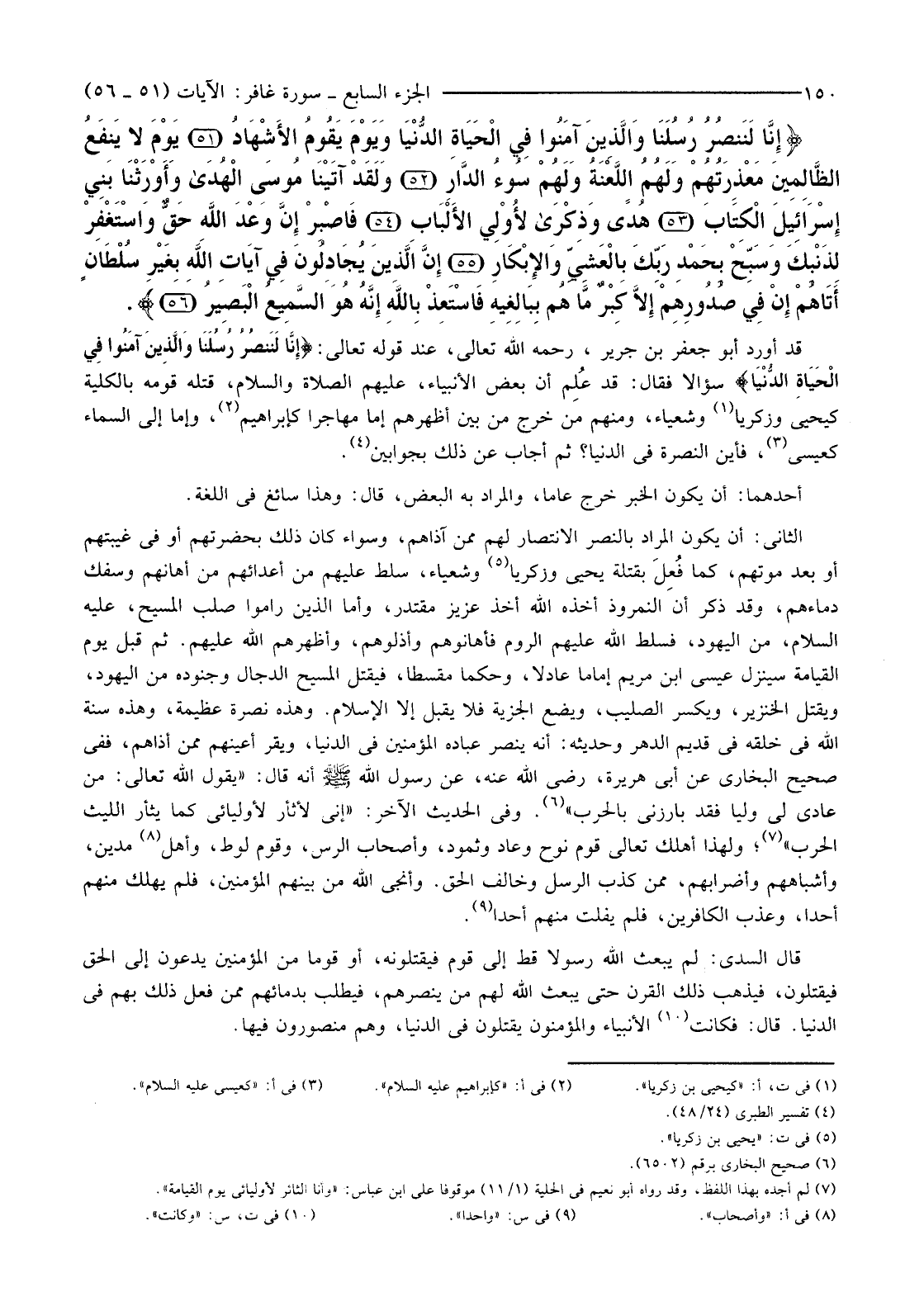 قَدْ أَوْرَدَ أَبُو جَعْفَرِ بْنُ جَرِيرٍ، رَحِمَهُ اللَّهُ تَعَالَى، عِنْدَ قَوْلِهِ تَعَالَى: {إِنَّا لَنَنْصُرُ رُسُلَنَا وَالَّذِينَ آمَنُوا فِي الْحَيَاةِ الدُّنْيَا} سُؤَالًا فَقَالَ: قَدْ عُلِم أَنَّ بَعْضَ الْأَنْبِيَاءِ، عَلَيْهِمُ الصَّلَاةُ وَالسَّلَامُ، قَتَلَهُ قَوْمُهُ بِالْكُلِّيَّةِ كَيَحْيَى وَزَكَرِيَّا (1) وَشَعْيَاءَ، وَمِنْهُمْ مَنْ خَرَجَ مِنْ بَيْنِ أَظْهُرِهِمْ إِمَّا مُهَاجِرًا كَإِبْرَاهِيمَ (2) ، وَإِمَّا إِلَى السَّمَاءِ كَعِيسَى (3) ، فَأَيْنَ النُّصْرَةُ فِي الدُّنْيَا؟ ثُمَّ أَجَابَ عَنْ ذَلِكَ بِجَوَابَيْنِ (4) .