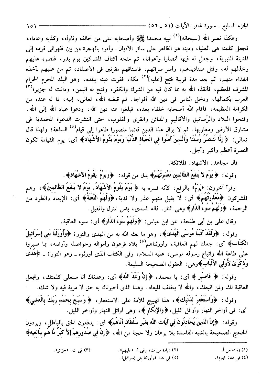 وَهَكَذَا نَصَرَ اللَّهُ [سُبْحَانَهُ] (1) نَبِيَّهُ مُحَمَّدًا صَلَّى اللَّهُ عَلَيْهِ وَسَلَّمَ وَأَصْحَابَهُ عَلَى مَنْ خَالَفَهُ وَنَاوَأَهُ، وَكَذَّبَهُ وَعَادَاهُ، فَجَعَلَ كَلِمَتَهُ هِيَ الْعُلْيَا، وَدِينَهُ هُوَ الظَّاهِرَ عَلَى سَائِرِ الْأَدْيَانِ. وَأَمَرَهُ بِالْهِجْرَةِ مِنْ بَيْنِ ظَهْرَانَيْ قَوْمِهِ إِلَى الْمَدِينَةِ النَّبَوِيَّةِ، وَجَعَلَ لَهُ فِيهَا أَنْصَارًا وَأَعْوَانًا، ثُمَّ مَنَحَهُ أَكْتَافَ الْمُشْرِكِينَ يَوْمَ بَدْرٍ، فَنَصْرَهُ عَلَيْهِمْ وَخَذَلَهُمْ لَهُ، وَقَتَلَ صَنَادِيدَهُمْ، وَأَسَرَ سَرَاتَهُمْ، فَاسْتَاقَهُمْ مُقَرَّنِينَ فِي الْأَصْفَادِ، ثُمَّ مَنَّ عَلَيْهِمْ بِأَخْذِهِ الْفِدَاءَ مِنْهُمْ، ثُمَّ بَعْدَ مُدَّةٍ قَرِيبَةٍ فَتَحَ [عَلَيْهِ] (2) مَكَّةَ، فَقَرَّتْ عَيْنُهُ بِبَلَدِهِ، وَهُوَ الْبَلَدُ الْمُحَرَّمُ الْحَرَامُ الْمُشَرَّفُ الْمُعَظَّمُ، فَأَنْقَذَهُ اللَّهُ بِهِ مِمَّا كَانَ فِيهِ مِنَ الشِّرْكِ وَالْكُفْرِ، وَفَتَحَ لَهُ الْيَمَنَ، وَدَانَتْ لَهُ جَزِيرَةُ (3) الْعَرَبِ بِكَمَالِهَا، وَدَخَلَ النَّاسُ فِي دِينِ اللَّهِ أَفْوَاجًا. ثُمَّ قَبَضَهُ اللَّهُ، تَعَالَى، إِلَيْهِ لِمَا لَهُ عِنْدَهُ مِنَ الْكَرَامَةِ الْعَظِيمَةِ، فَأَقَامَ اللَّهُ أَصْحَابَهُ خُلَفَاءَ بَعْدَهُ، فَبَلَّغُوا عَنْهُ دِينَ اللَّهِ، وَدَعَوْا عِبَادَ اللَّهِ إِلَى اللَّهِ. وَفَتَحُوا الْبِلَادَ وَالرَّسَاتِيقَ وَالْأَقَالِيمَ وَالْمَدَائِنَ وَالْقُرَى وَالْقُلُوبَ، حَتَّى انْتَشَرَتِ الدَّعْوَةُ الْمُحَمَّدِيَّةُ فِي مَشَارِقِ الْأَرْضِ وَمَغَارِبِهَا. ثُمَّ لَا يَزَالُ هَذَا الدِّينُ قَائِمًا مَنْصُورًا ظَاهِرًا إِلَى قِيَامِ (4) السَّاعَةِ؛ وَلِهَذَا قَالَ تَعَالَى: {إِنَّا لَنَنْصُرُ رُسُلَنَا وَالَّذِينَ آمَنُوا فِي الْحَيَاةِ الدُّنْيَا وَيَوْمَ يَقُومُ الأشْهَادُ} أَيْ: يَوْمَ الْقِيَامَةِ تَكُونُ النُّصْرَةُ أَعْظَمَ وَأَكْبَرَ وَأَجَلَّ.