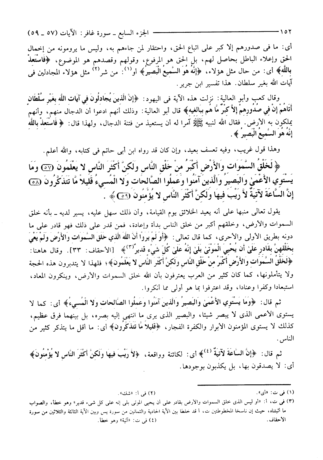 {لَخَلْقُ السَّموَاتِ وَالأرْضِ أَكْبَرُ مِنْ خَلْقِ النَّاسِ وَلَكِنَّ أَكْثَرَ النَّاسِ لَا يَعْلَمُونَ (57) وَمَا يَسْتَوِي الأعْمَى وَالْبَصِيرُ وَالَّذِينَ آمَنُوا وَعَمِلُوا الصَّالِحَاتِ وَلا الْمُسِيءُ قَلِيلا مَا تَتَذَكَّرُونَ (58) }