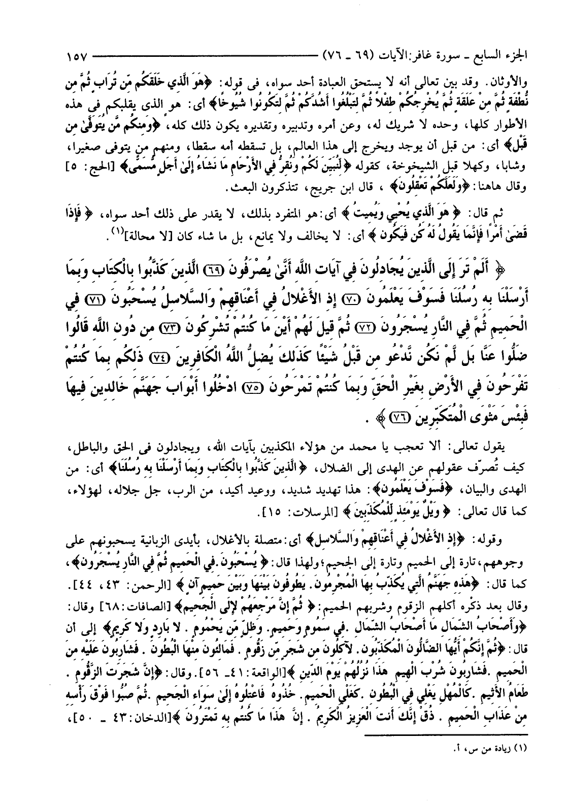 وَقَوْلُهُ: {إِذِ الأغْلالُ فِي أَعْنَاقِهِمْ وَالسَّلاسِلُ} أَيْ: مُتَّصِلَةٌ بِالْأَغْلَالِ، بِأَيْدِي الزَّبَانِيَةِ يَسْحَبُونَهُمْ عَلَى وُجُوهِهِمْ، تَارَةً إِلَى الْحَمِيمِ وَتَارَةً إِلَى الْجَحِيمِ؛ وَلِهَذَا قَالَ: {يُسْحَبُونَ. فِي الْحَمِيمِ ثُمَّ فِي النَّارِ يُسْجَرُونَ} ، كَمَا قَالَ: {هَذِهِ جَهَنَّمُ الَّتِي يُكَذِّبُ بِهَا الْمُجْرِمُونَ يَطُوفُونَ بَيْنَهَا وَبَيْنَ حَمِيمٍ آنٍ} [الرَّحْمَنِ: 43، 44] . وَقَالَ بَعْدَ ذكْره أَكْلَهُمُ الزَّقُّومَ وَشُرْبَهُمُ الْحَمِيمَ: {ثُمَّ إِنَّ مَرْجِعَهُمْ لإلَى الْجَحِيمِ} [الصَّافَّاتِ:68] وَقَالَ {وَأَصْحَابُ الشِّمَالِ مَا أَصْحَابُ الشِّمَالِ. فِي سَمُومٍ وَحَمِيمٍ. وَظِلٍّ مِنْ يَحْمُومٍ. لَا بَارِدٍ وَلا كَرِيمٍ} إِلَى أَنْ قَالَ: {ثُمَّ إِنَّكُمْ أَيُّهَا الضَّالُّونَ الْمُكَذِّبُونَ. لآكِلُونَ مِنْ شَجَرٍ مِنْ زَقُّومٍ. فَمَالِئُونَ مِنْهَا الْبُطُونَ. فَشَارِبُونَ عَلَيْهِ مِنَ الْحَمِيمِ. فَشَارِبُونَ شُرْبَ الْهِيمِ. هَذَا نزلُهُمْ يَوْمَ الدِّينِ} [الْوَاقِعَةِ: 41 -56] . وَقَالَ {إِنَّ شَجَرَةَ الزَّقُّومِ. طَعَامُ الأثِيمِ. كَالْمُهْلِ يَغْلِي فِي الْبُطُونِ. كَغَلْيِ الْحَمِيمِ. خُذُوهُ فَاعْتِلُوهُ إِلَى سَوَاءِ الْجَحِيمِ. ثُمَّ صُبُّوا فَوْقَ رَأْسِهِ مِنْ عَذَابِ الْحَمِيمِ. ذُقْ إِنَّكَ أَنْتَ الْعَزِيزُ الْكَرِيمُ. إِنَّ هَذَا مَا كُنْتُمْ بِهِ تَمْتَرُونَ} [الدُّخَانِ: 43 -50] ،