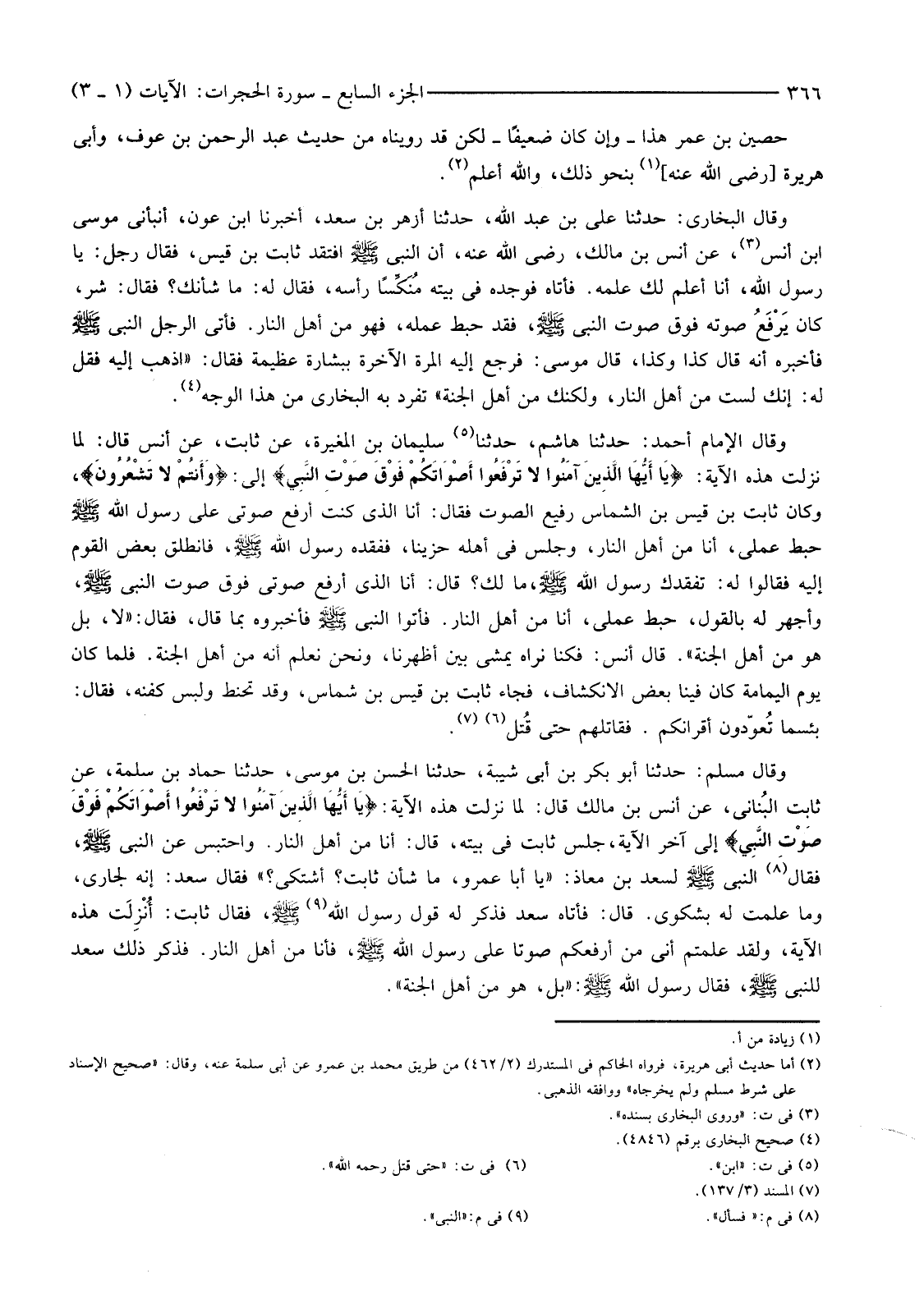 وَقَالَ مُسْلِمٌ: حَدَّثَنَا أَبُو بَكْرِ بْنُ أَبِي شَيْبَةَ، حَدَّثَنَا الْحَسَنُ بْنُ مُوسَى، حَدَّثَنَا حَمَّادِ بْنِ سَلَمَةَ، عَنْ ثَابِتٍ البُناني، عَنْ أَنَسِ بْنِ مَالِكٍ قَالَ: لَمَّا نَزَلَتْ هَذِهِ الْآيَةُ: {يَا أَيُّهَا الَّذِينَ آمَنُوا لَا تَرْفَعُوا أَصْوَاتَكُمْ فَوْقَ صَوْتِ النَّبِيِّ} إِلَى آخِرِ الْآيَةِ، جَلَسَ ثَابِتٌ فِي بَيْتِهِ، قَالَ: أَنَا مِنْ أَهْلِ النَّارِ. وَاحْتَبَسَ عَنِ النَّبِيِّ صَلَّى اللَّهُ عَلَيْهِ وَسَلَّمَ، فَقَالَ (8) النَّبِيُّ صَلَّى اللَّهُ عَلَيْهِ وَسَلَّمَ لِسَعْدِ بْنِ مُعَاذٍ: "يَا أَبَا عَمْرٍو، مَا شَأْنُ ثَابِتٍ؟ أَشْتَكَى؟ " فَقَالَ سَعْدٌ: إِنَّهُ لَجَارِي، وَمَا عَلِمْتُ لَهُ بِشَكْوَى. قَالَ: فَأَتَاهُ سَعْدٌ فَذَكَرَ لَهُ قَوْلَ رسول الله (9) صلى الله عليه وسلم، فقال ثَابِتٌ: أُنزلَت هَذِهِ الْآيَةُ، وَلَقَدْ عَلِمْتُمْ أَنِّي مِنْ أَرْفَعِكُمْ صَوْتًا عَلَى رَسُولِ اللَّهِ صَلَّى اللَّهُ عَلَيْهِ وَسَلَّمَ، فَأَنَا مِنْ أَهْلِ النَّارِ. فَذَكَرَ ذَلِكَ سَعْدٌ لِلنَّبِيِّ صَلَّى اللَّهُ عَلَيْهِ وَسَلَّمَ، فَقَالَ رَسُولُ اللَّهِ صَلَّى اللَّهُ عَلَيْهِ وسلم: "بل، هو من أهل الجنة".