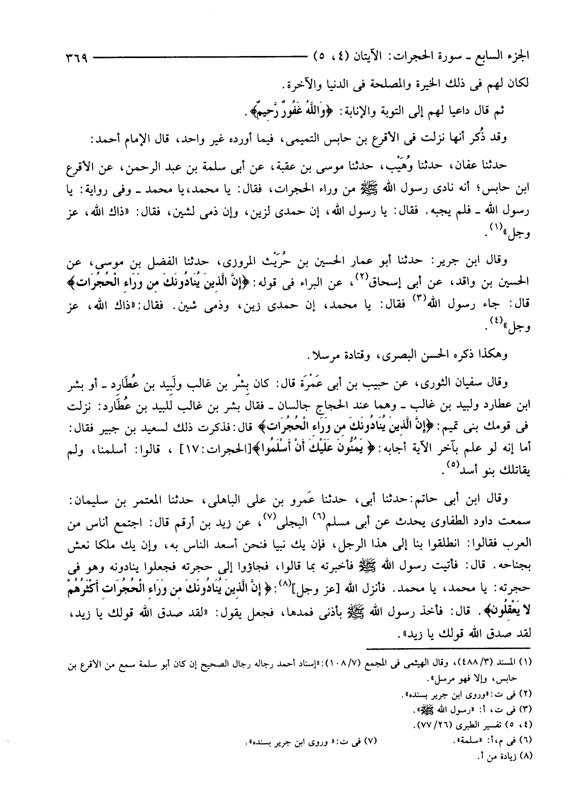 وَقَالَ ابْنُ أَبِي حَاتِمٍ: حَدَّثَنَا أَبِي، حَدَّثَنَا عَمرو بْنُ عَلِيٍّ الْبَاهِلِيُّ، حَدَّثَنَا الْمُعْتَمِرُ بْنُ سُلَيْمَانَ: سَمِعْتُ دَاوُدَ الطُّفَّاوِيَّ يُحَدِّثُ عَنْ أَبِي مُسْلِمٍ (6) الْبَجَلِيِّ (7) ، عَنْ زَيْدِ بْنِ أَرْقَمَ قَالَ: اجْتَمَعَ أُنَاسٌ مِنَ الْعَرَبِ فَقَالُوا: انْطَلِقُوا بِنَا إِلَى هَذَا الرَّجُلِ، فَإِنْ يَكُ نَبِيًّا فَنَحْنُ أَسْعَدُ النَّاسِ بِهِ، وَإِنْ يَكُ مَلِكًا نَعِشْ بِجَنَاحِهِ. قَالَ: فَأَتَيْتُ رَسُولَ اللَّهِ صَلَّى اللَّهُ عَلَيْهِ وَسَلَّمَ فَأَخْبَرْتُهُ بِمَا قَالُوا، فَجَاءُوا إِلَى حُجْرَتِهِ فَجَعَلُوا يُنَادُونَهُ وَهُوَ فِي حُجْرَتِهِ: يَا مُحَمَّدُ، يَا مُحَمَّدُ. فَأَنْزَلَ اللَّهُ [عَزَّ وَجَلَّ] (8) : {إِنَّ الَّذِينَ يُنَادُونَكَ مِنْ وَرَاءِ الْحُجُرَاتِ أَكْثَرُهُمْ لَا يَعْقِلُونَ} قَالَ: فَأَخَذَ رَسُولُ اللَّهِ صَلَّى اللَّهُ عَلَيْهِ وَسَلَّمَ بِأُذُنِي فَمَدَّهَا، فَجَعَلَ يَقُولُ: "لَقَدْ صَدَّقَ اللَّهُ قَوْلَكَ يَا زَيْدُ، لِقَدْ صَدَّقَ الله قولك يا زيد".
